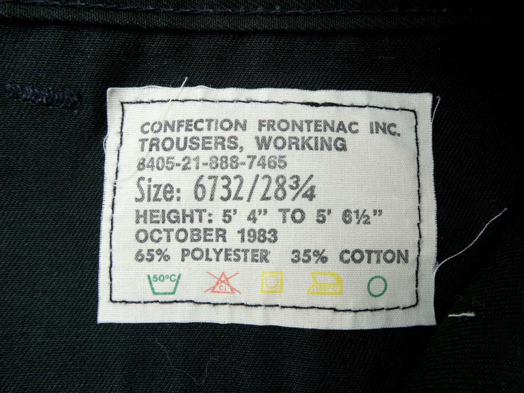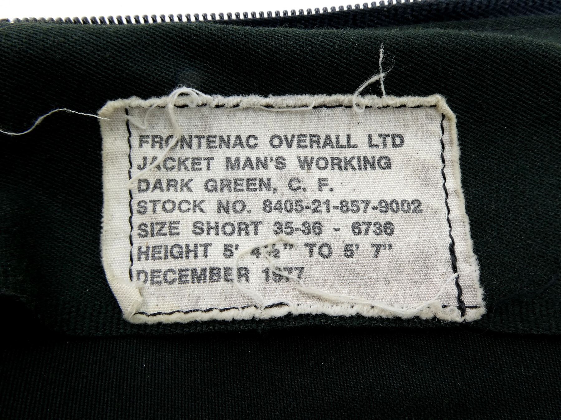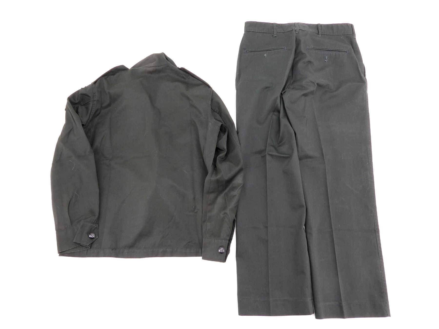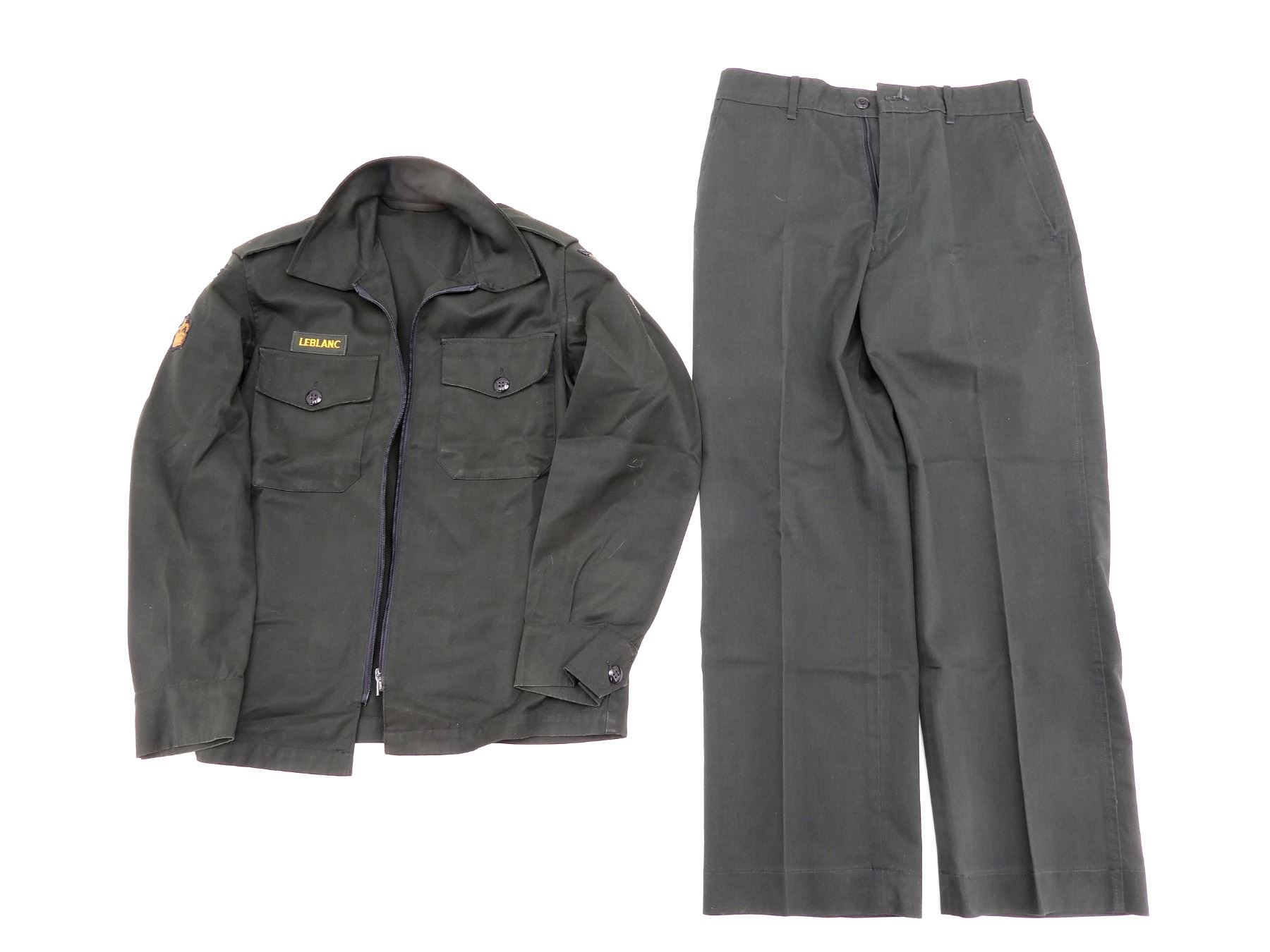 LOT INCLUDES: (1) DARK GREEN DRESS PANTS, MARKED: "CONFECTION FRONTENAC INC.TROUSERS, WORKING 8405-21-888-7465, SIZE: 6732/28 3/4, HEIGHT: 5' 4" TO 5' 6 1/2", OCTOBER 1983, 65% POLYESTER, 35% COTTON", (1) DARK GREEN LONG SLEEVE DRESS SHIRT, PATCHED: "LEBLANC", MARKED: "FRONTENAC OVERALL LTD JACKET MAN'S WORKING DARK GREEN, C. F., STOCK NO. 8405-21-857-9002, SIZE SHORT 35-36 - 6736, HEIGHT 5' 4 1/2 TO 5' 7", DECEMBER 1977. SEE PHOTOS.