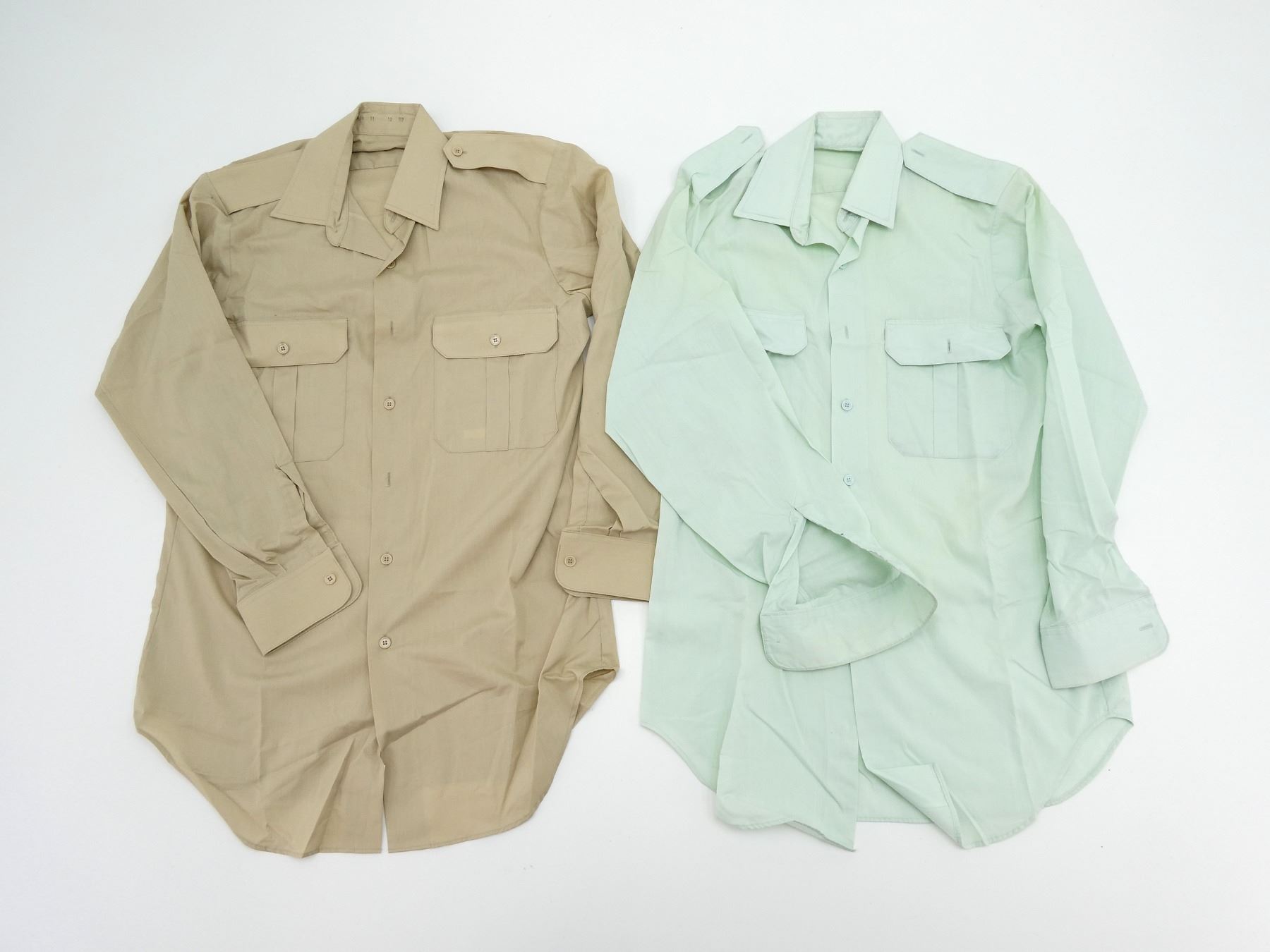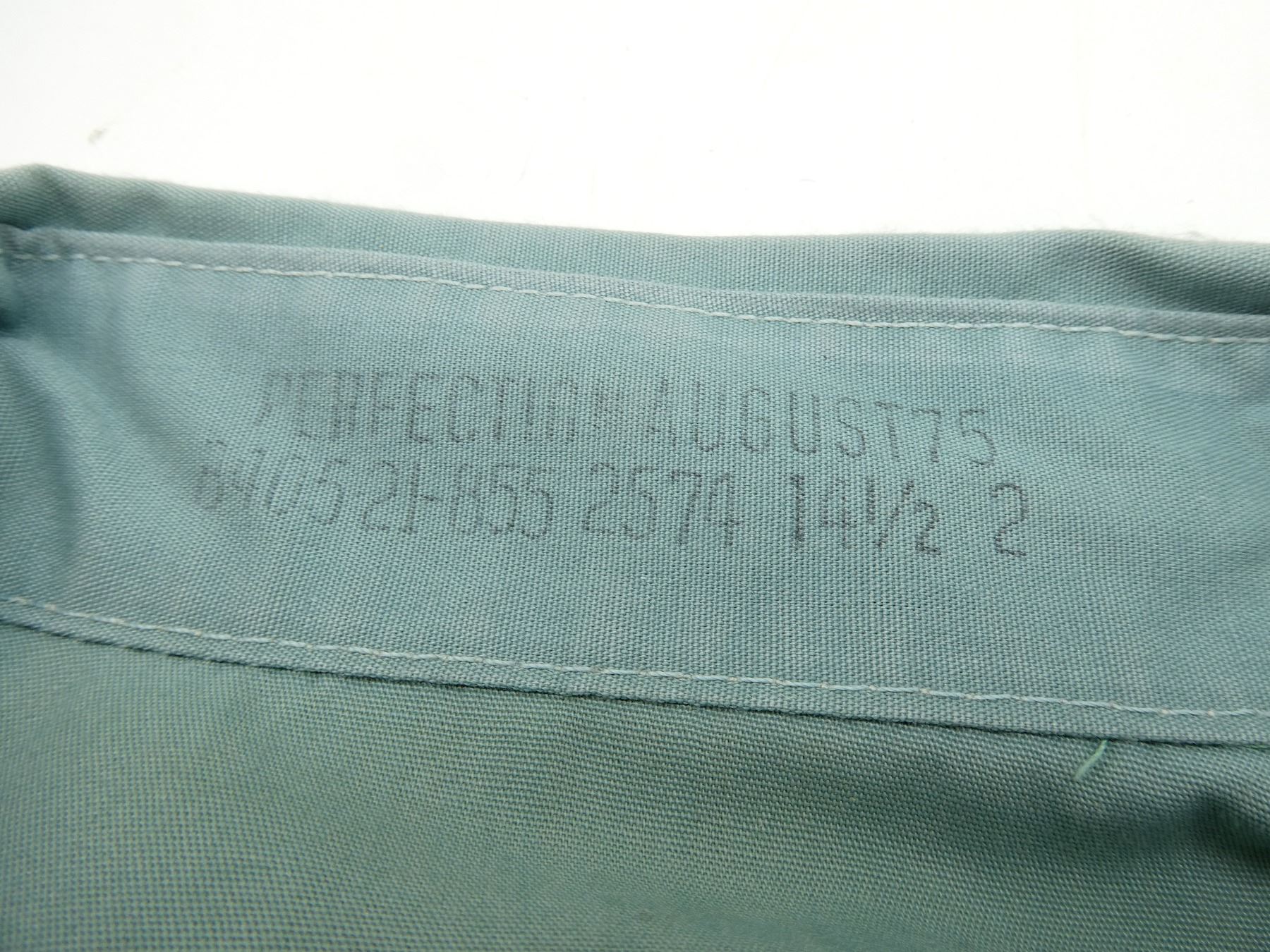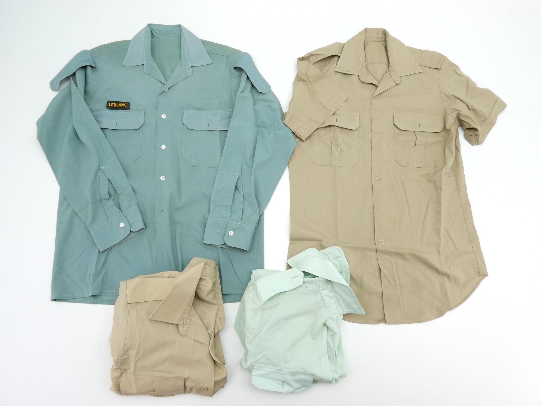 LOT INCLUDES: (1) TURQUOISE LONG SLEEVE DRESS SHIRT, MARKED: "LEBLANC" ON POCKET, COLLAR MARKED: " PERFECTION, AUGUST 75, 8405-21-855-2574, SIZE 14 1/2, (1) LIGHT TURQUOISE DRESS SHIRT, NO VISIBLE MARKINGS, (1) BEIGE LONG SLEEVE DRESS SHIRT, MARKED: " SIZE 14 1/2", (1) BEIGE SHORT SLEEVE DRESS SHIRT, MARKED: " SIZE 14 1/2". SEE PHOTOS.