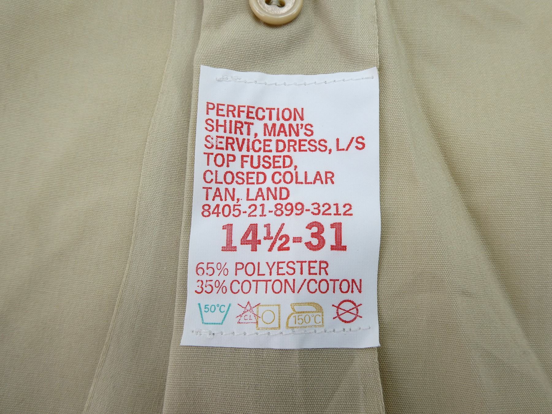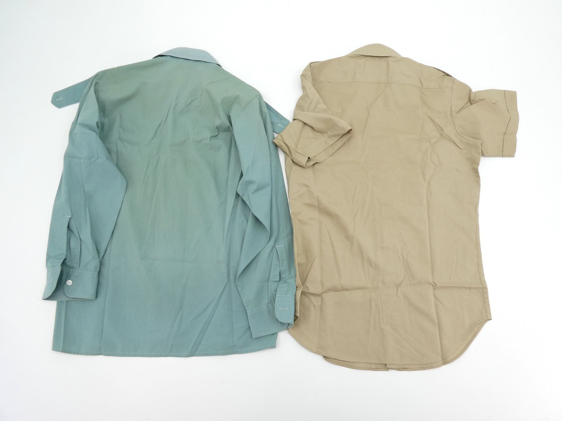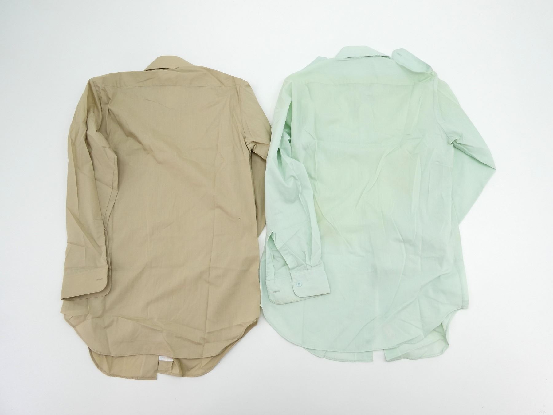 LOT INCLUDES: (1) TURQUOISE LONG SLEEVE DRESS SHIRT, MARKED: "LEBLANC" ON POCKET, COLLAR MARKED: " PERFECTION, AUGUST 75, 8405-21-855-2574, SIZE 14 1/2, (1) LIGHT TURQUOISE DRESS SHIRT, NO VISIBLE MARKINGS, (1) BEIGE LONG SLEEVE DRESS SHIRT, MARKED: " SIZE 14 1/2", (1) BEIGE SHORT SLEEVE DRESS SHIRT, MARKED: " SIZE 14 1/2". SEE PHOTOS.