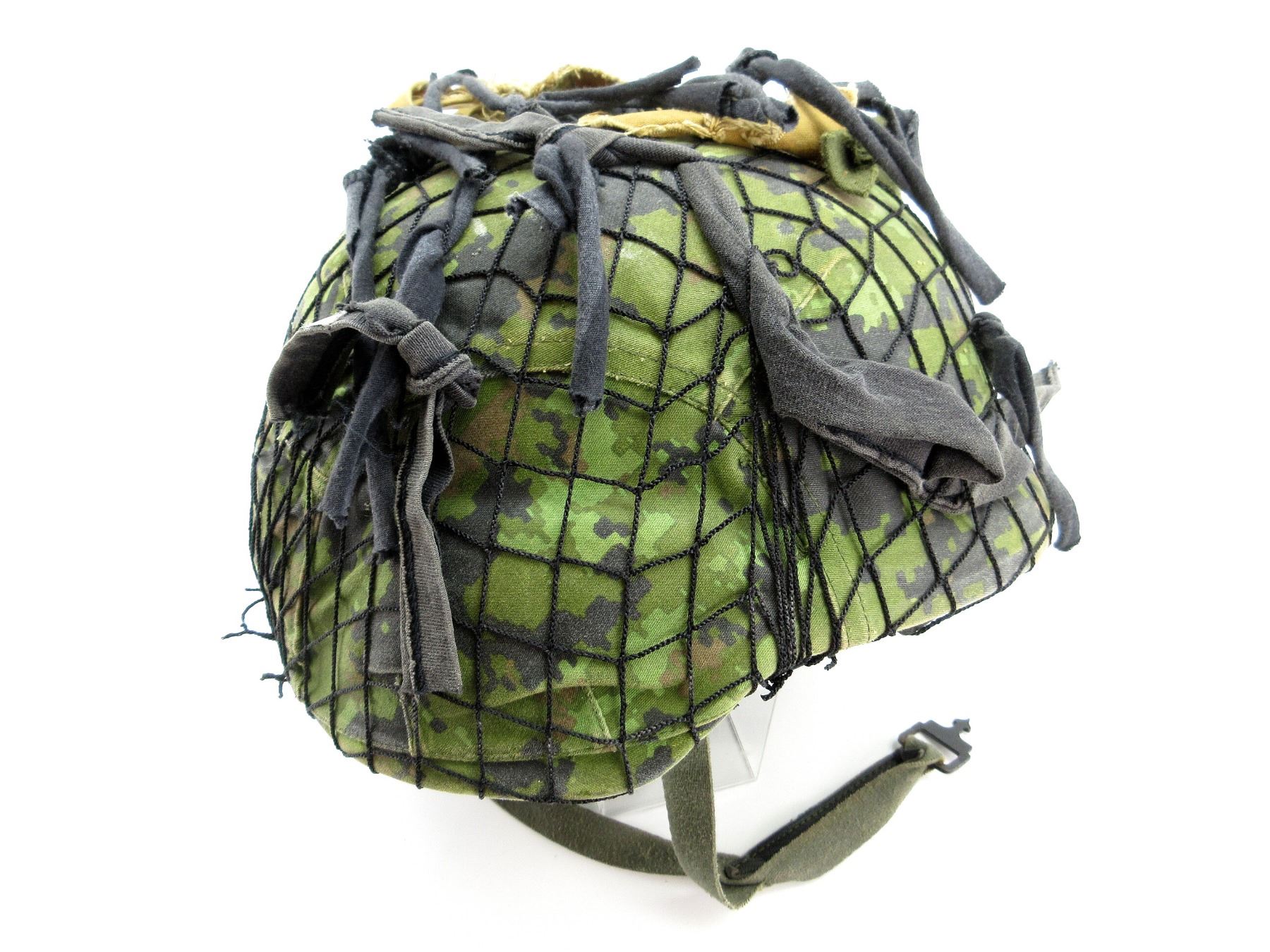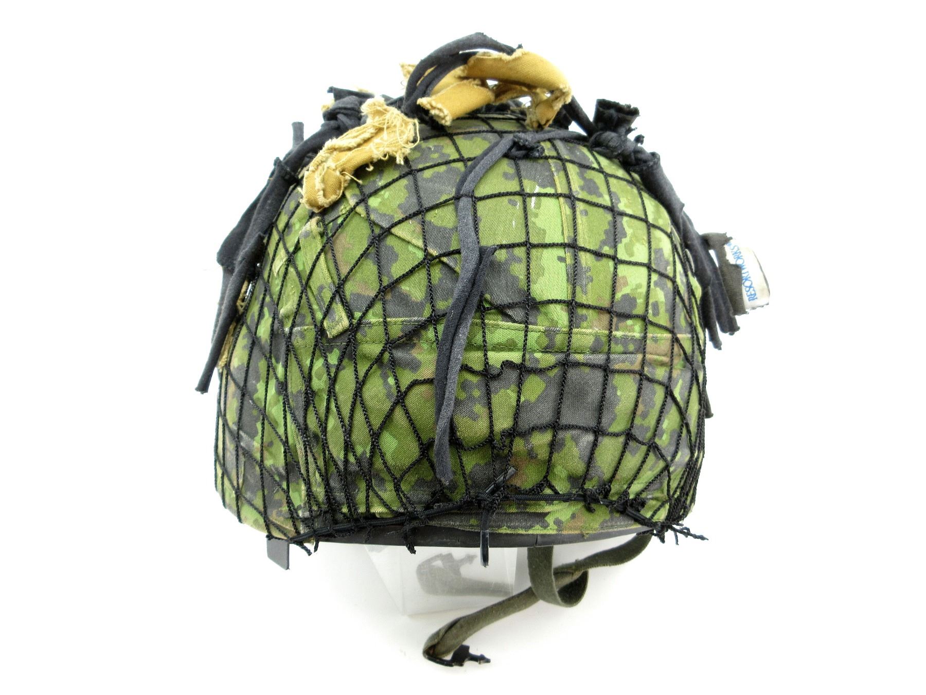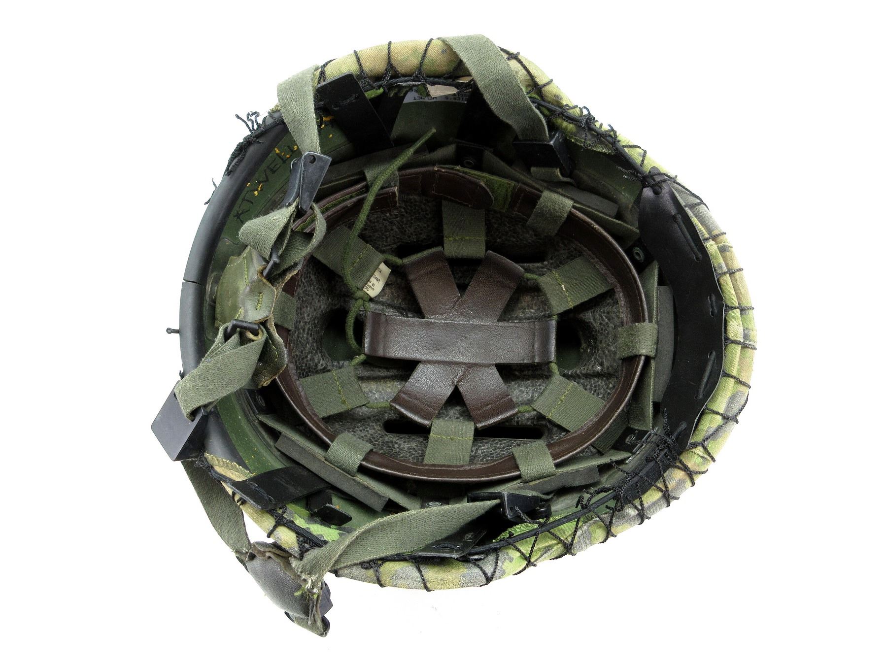 (1) GREEN KELVAR HELMET W/ CAMOUFLAGE HELMET COVER & BLACK NETTING, HEAD LINER LEATHER & CANVAS W/ CANVAS CHIN STRAP, HELMET MARKED: "SOLDIERS HELMET, X- LARGE", HAND WRITTEN: "ATWELL 144". SEE PHOTOS.