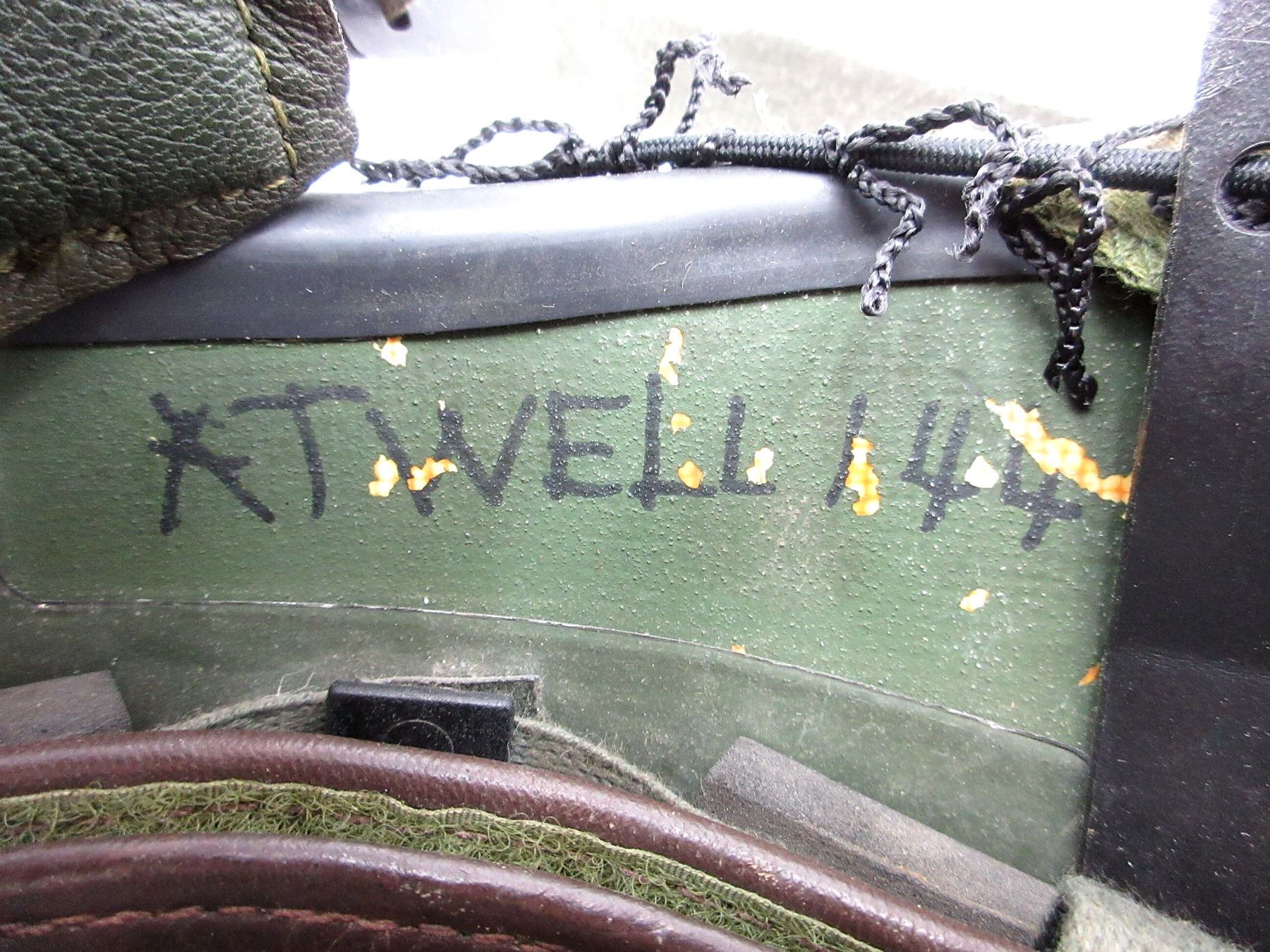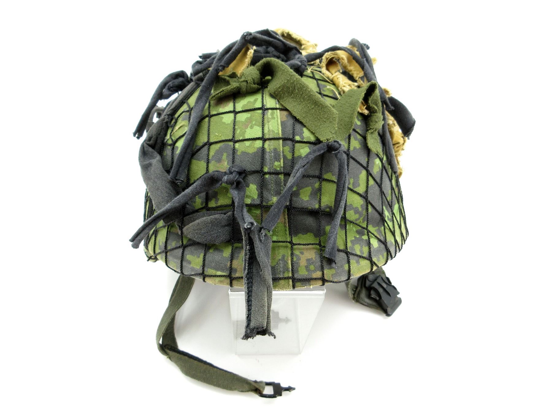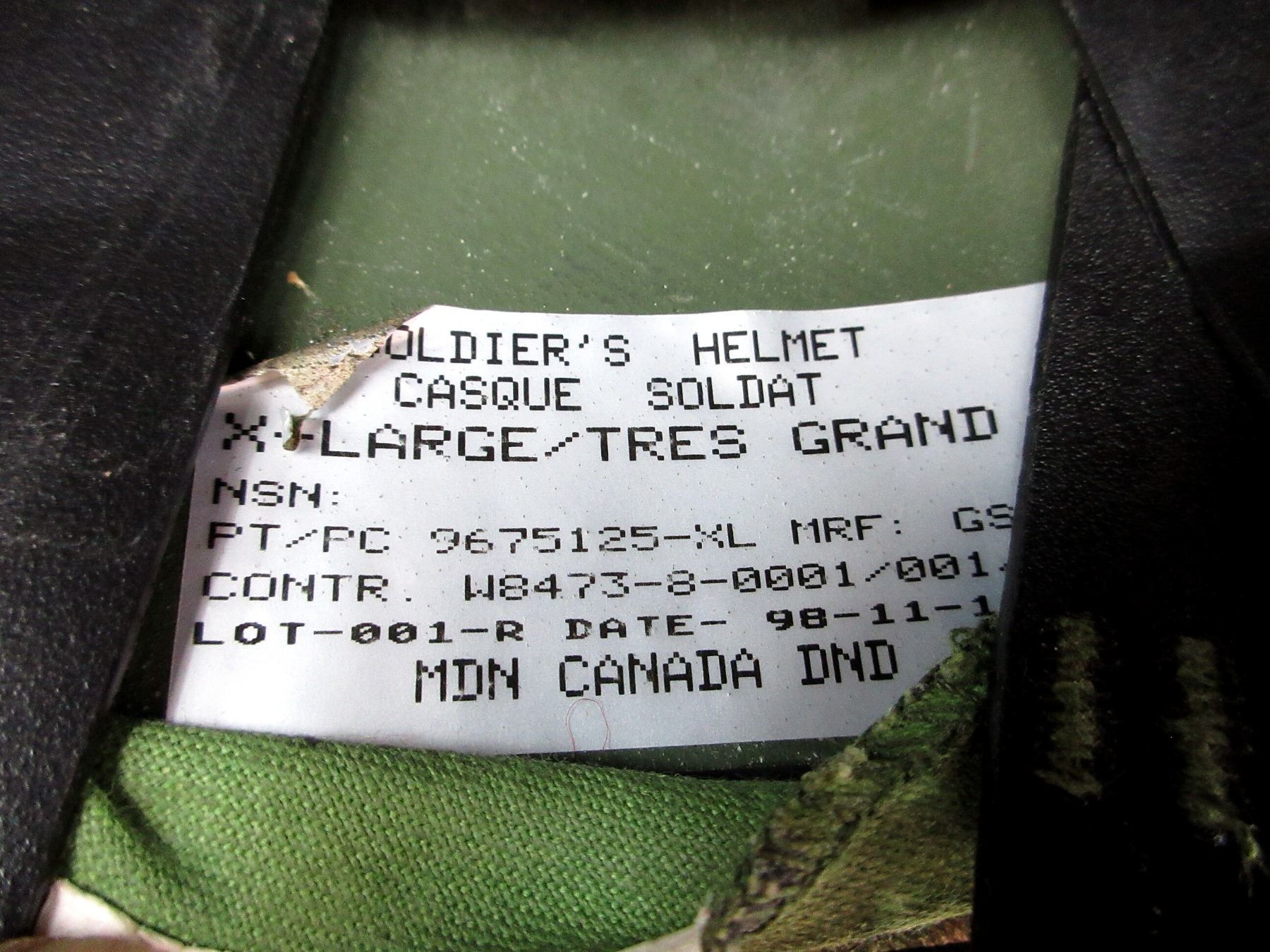 (1) GREEN KELVAR HELMET W/ CAMOUFLAGE HELMET COVER & BLACK NETTING, HEAD LINER LEATHER & CANVAS W/ CANVAS CHIN STRAP, HELMET MARKED: "SOLDIERS HELMET, X- LARGE", HAND WRITTEN: "ATWELL 144". SEE PHOTOS.