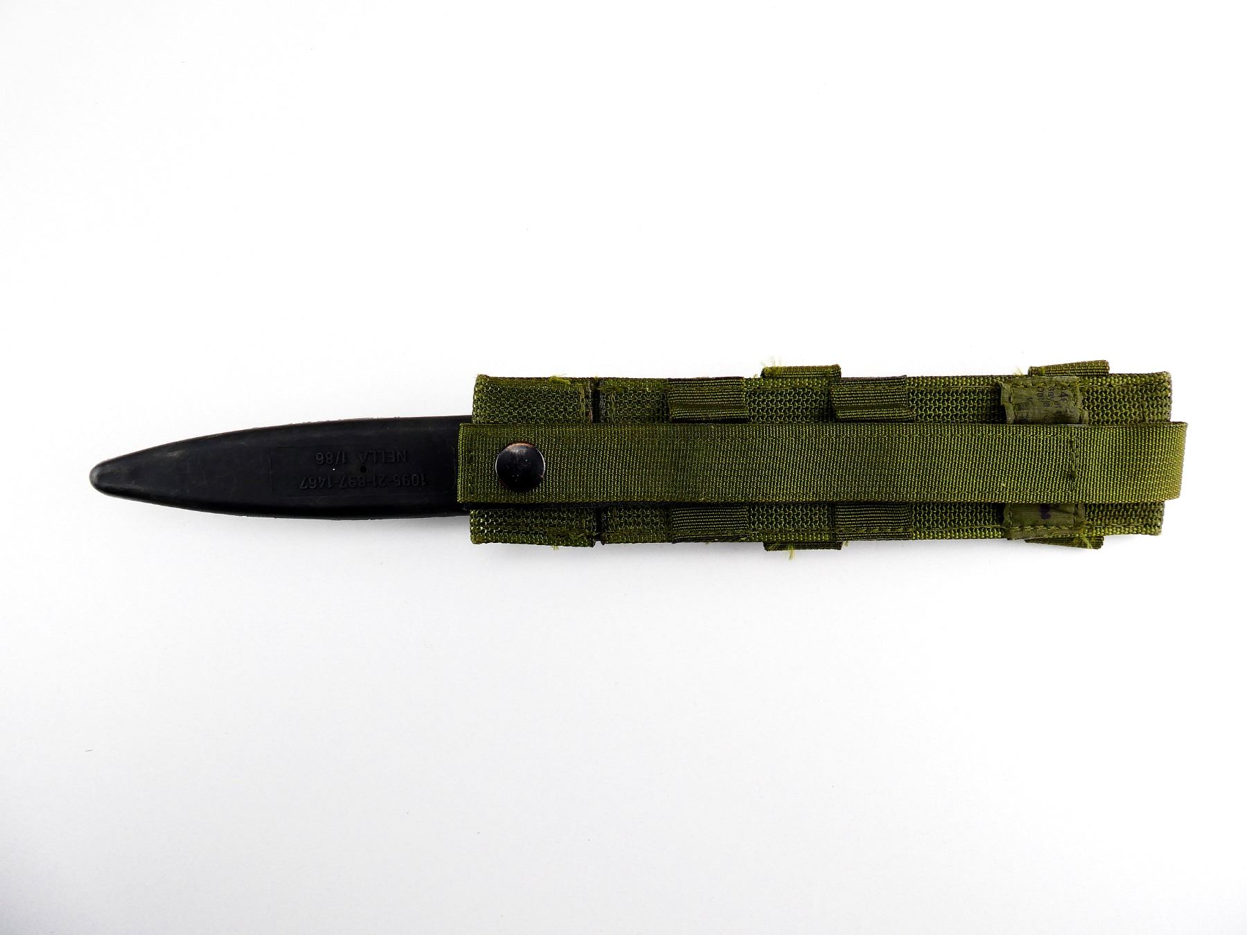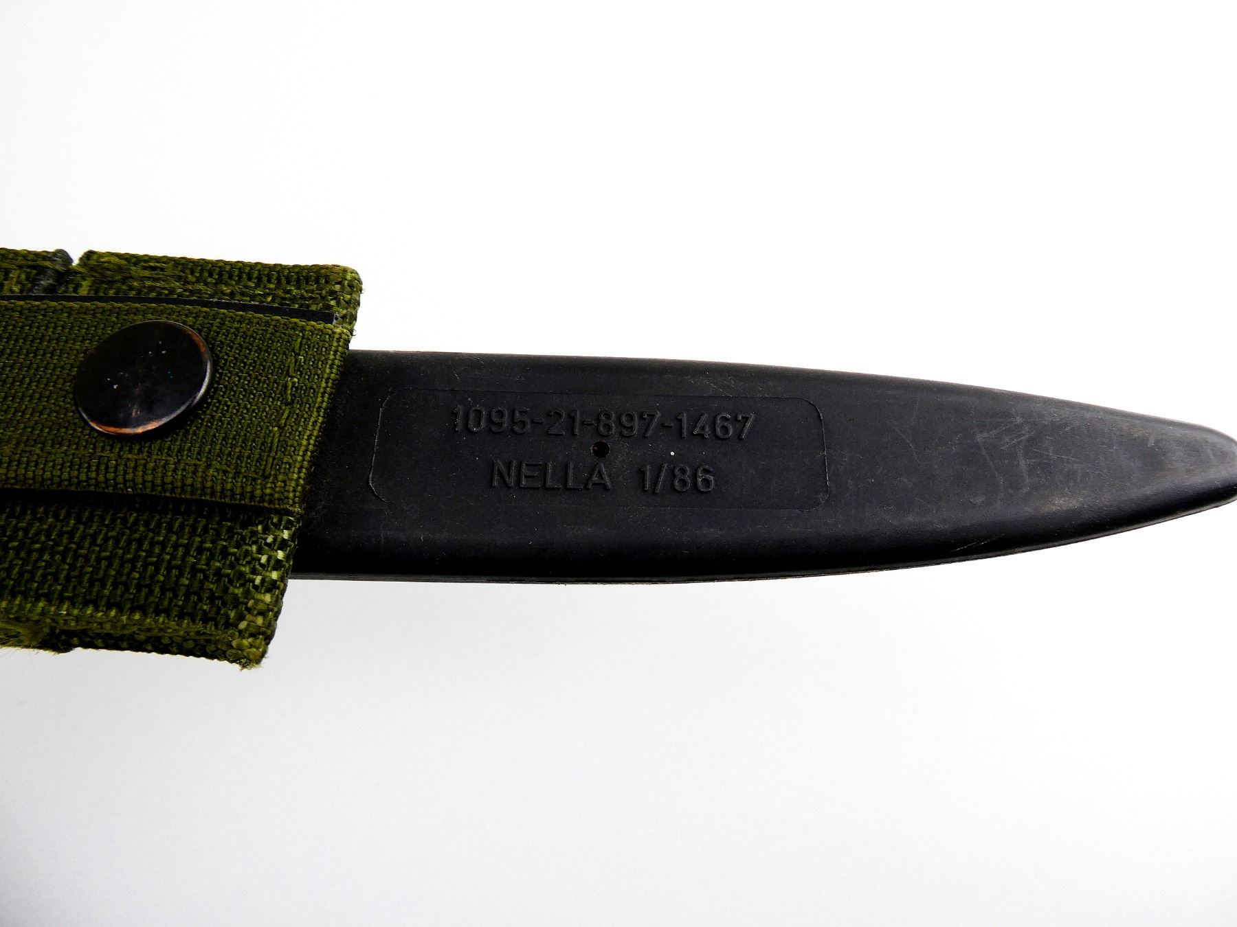(1) C7 / C8 SCABBARD (NO BAYONET), BLACK PLASTIC WITH GREEN NYLON FROG, SCABBARD MARKED: "1095-21-897-1467, NELLA 1/86", VARIOUS MARKINGS ON FROG, SCABBARD OAL APPROX. 8 1/8". SEE PHOTOS.