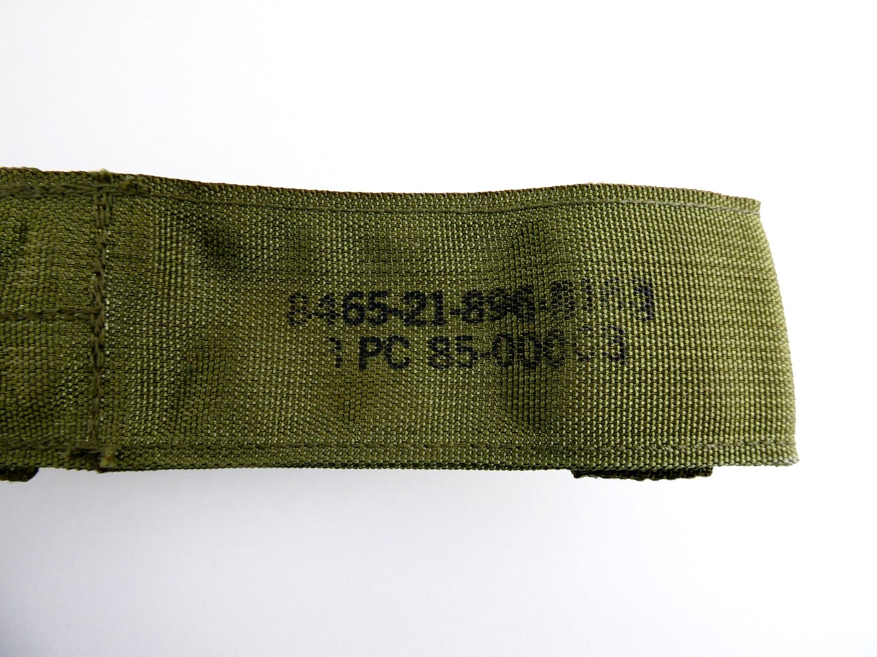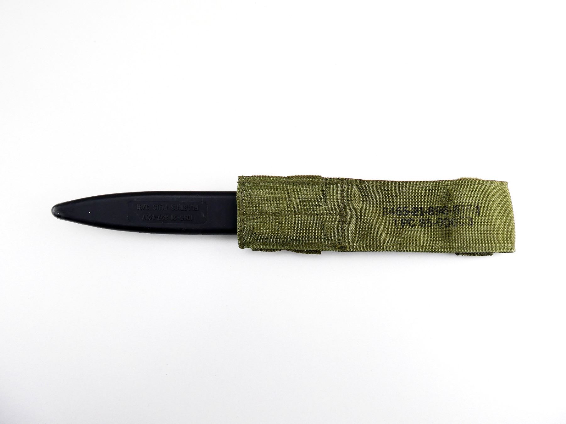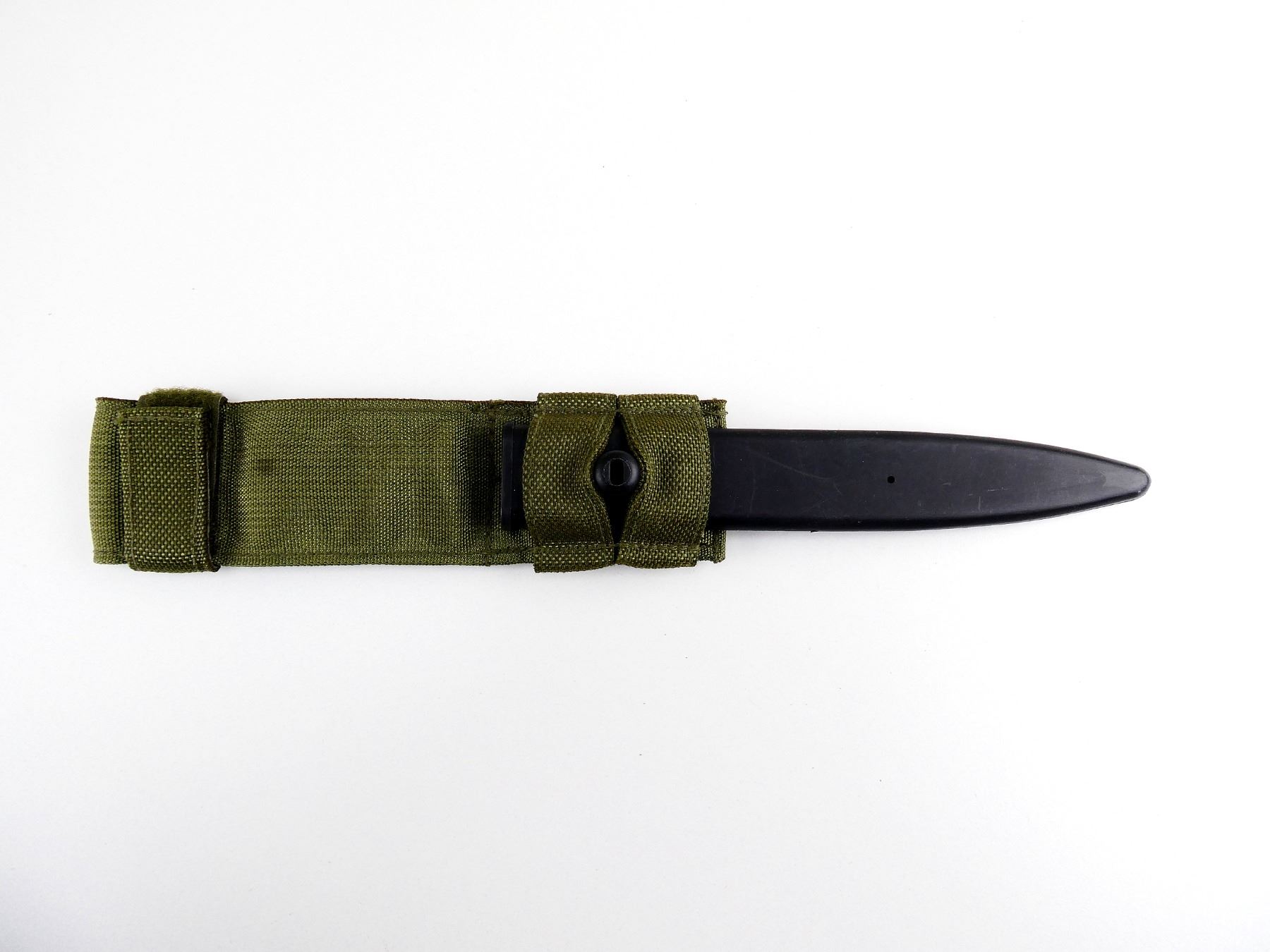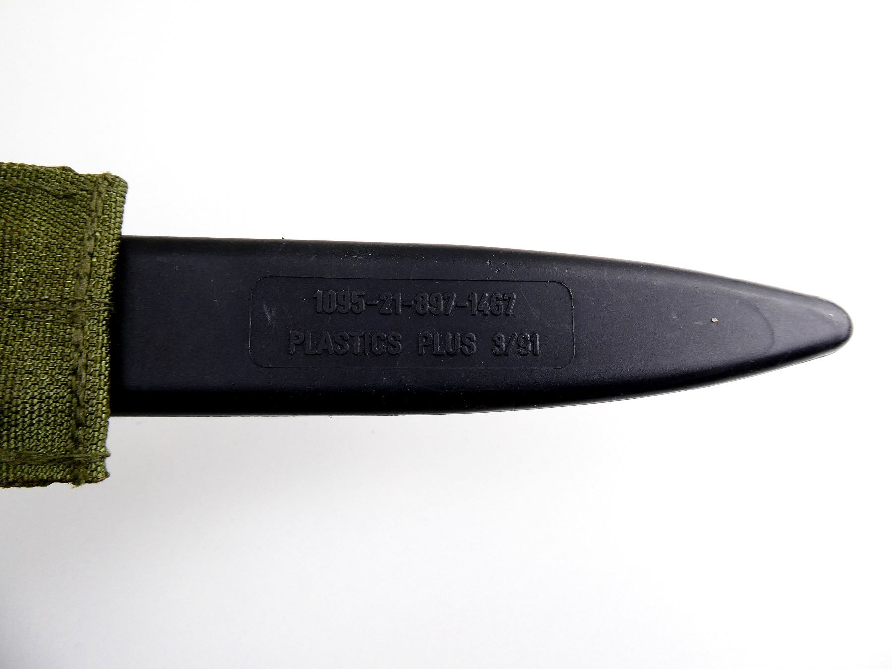 (1) C7 / C8 SCABBARD (NO BAYONET), BLACK PLASTIC WITH GREEN NYLON FROG, SCABBARD MARKED: "1095-21-897-1467, PLASTICS PLUS 3/91", VARIOUS MARKINGS ON FROG, SCABBARD OAL APPROX. 8 1/8". SEE PHOTOS.