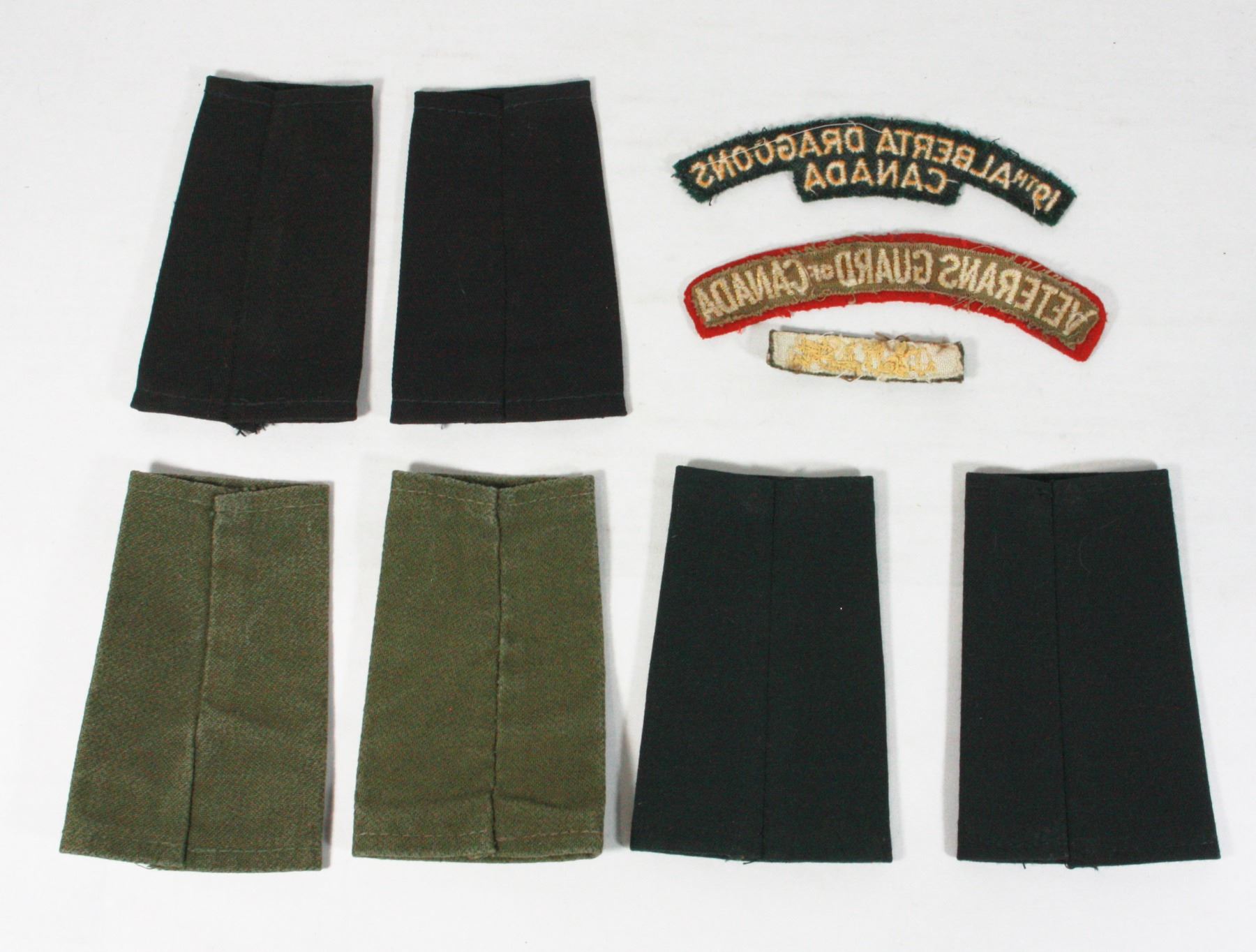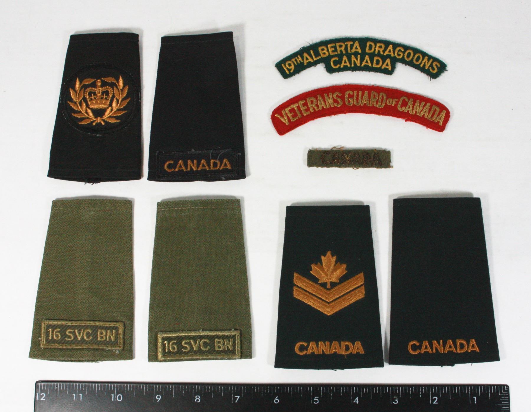 ADDITIONAL BOARDS INCLUDING PAIR 16 SVC BN CANADIAN CANADA MILITARY, WW1 CANADIAN CLOTH SHOULDER TITLE INSIGNIA GOLD WIRE ON GREEN WORLD WAR ONE CANADIAN EXPEDITIONARY FORCES CEF INSIGNIA BADGES ALLIED FORCES, AND PAIR CANADIAN MILITARY CLOTH SHOULDER TITLES 19TH ALBERTA DRAGOONS CANADA AND VETERANS GUARD OF CANADA 1940'S 1950'S