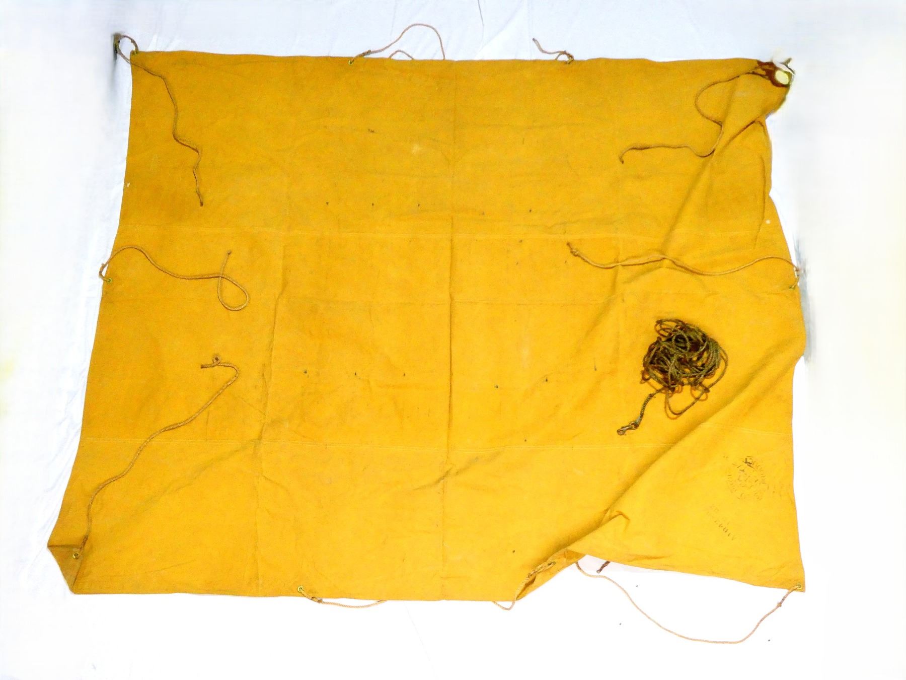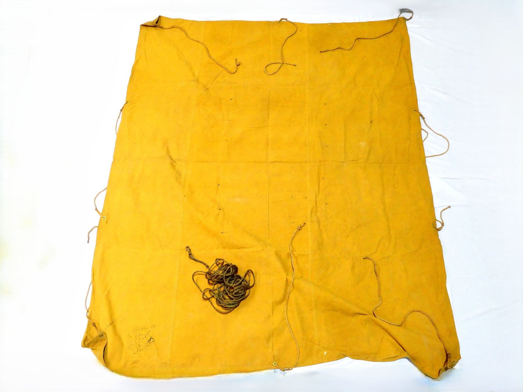 LOT INCLUDES; (1) HEAVY-DUTY YELLOW CANVAS TARPAULIN, INK STAMPED: "A1042-8 X 10, 10 OZ" & "TESTED PROVEN PRODUCTS" IN A CIRCLE, WITH MAPLE LEAF SYMBOL MARKED: "CTC" IN THE CENTER, 10 ROPE TIES ATTACHED TO BRASS GROMMETS, TARPAULIN APPROX. 111.5" X 92.5", SHOWS AGE / SOME WEAR & (1) 1/4" MANILLA ROPE WITH BRASS HOOK & METAL FITTING, NO VISIBLE MARKINGS, OAL APPROX. 46' 6". SEE PHOTOS.