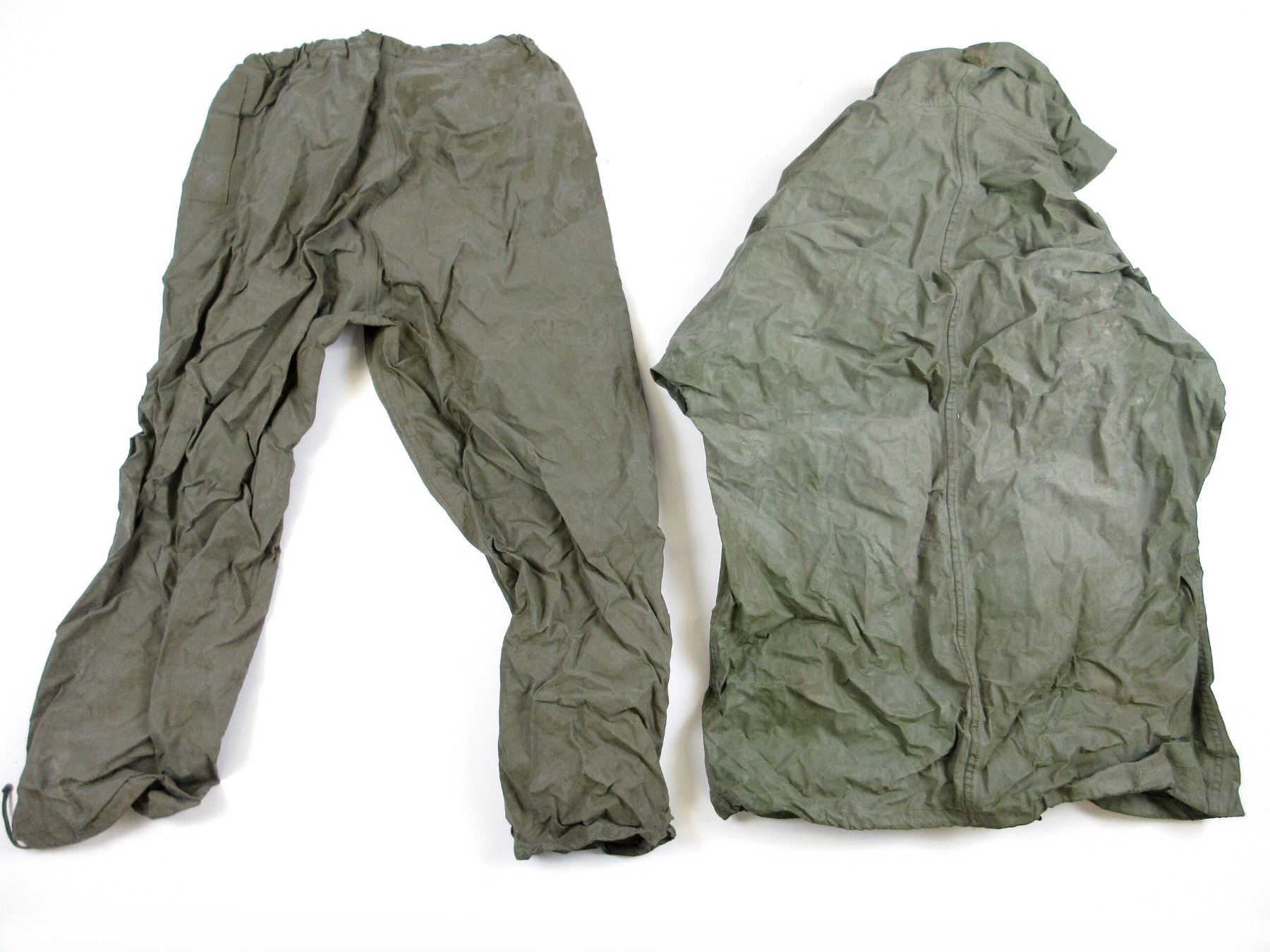 LOT INCLUDES; (1) GREEN RUBBERIZED NYLON WET WEATHER RAINCOAT / OVERCOAT, SIZE LARGE-TALL, VELCRO / ZIPPERED FRONT (WORKS), SHOWS AGE / WEAR & (1) GREEN RUBBERIZED NYLON WET WEATHER FIELD TYPE PANTS, SIZE LARGE-REGULAR, VARIOUS MARKINGS, ELASTIC WAIST, BUTTON FLY, SHOWS AGE / WEAR. SEE PHOTOS.