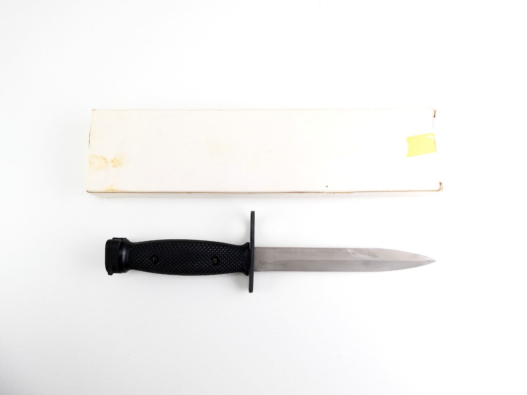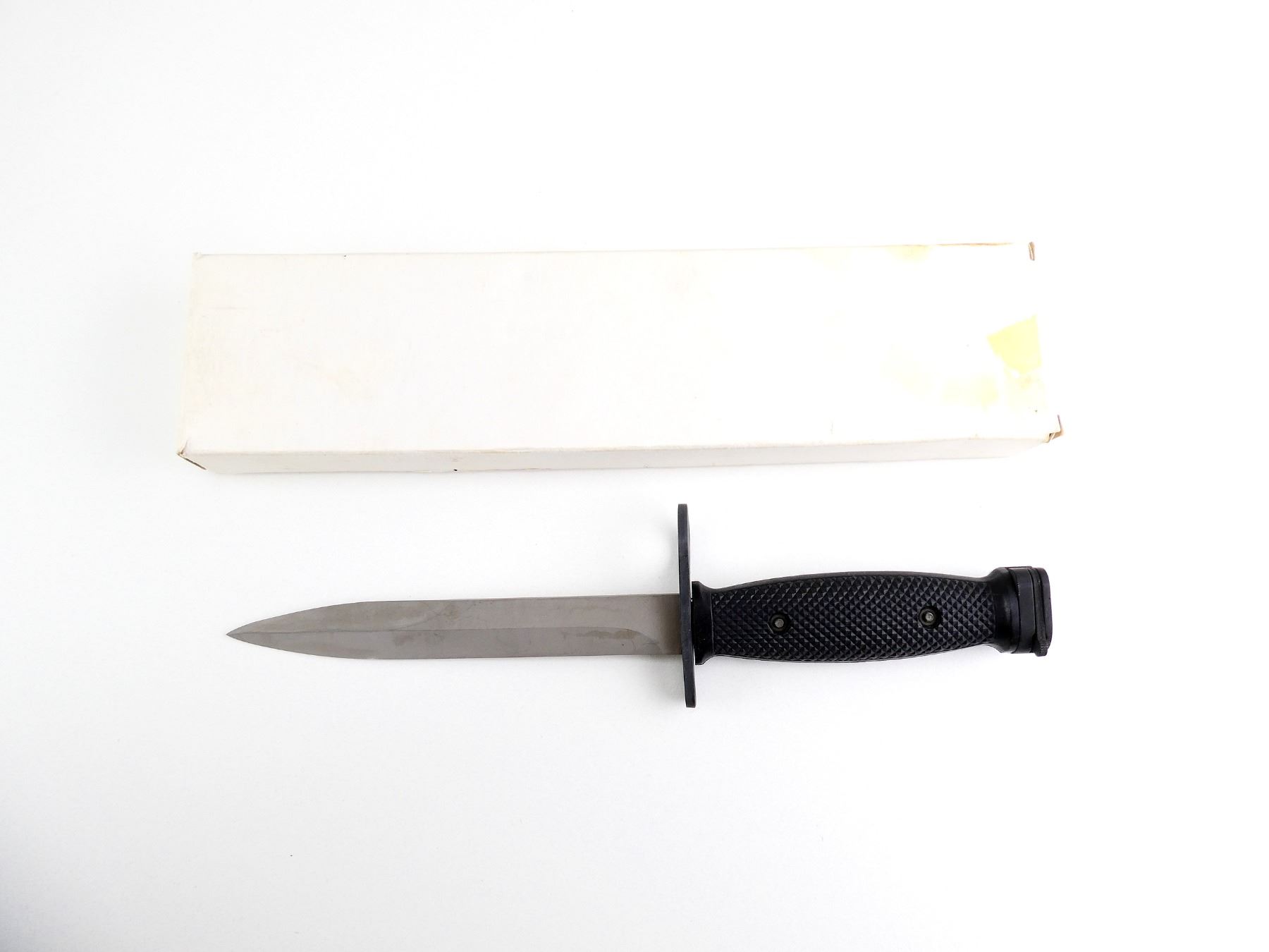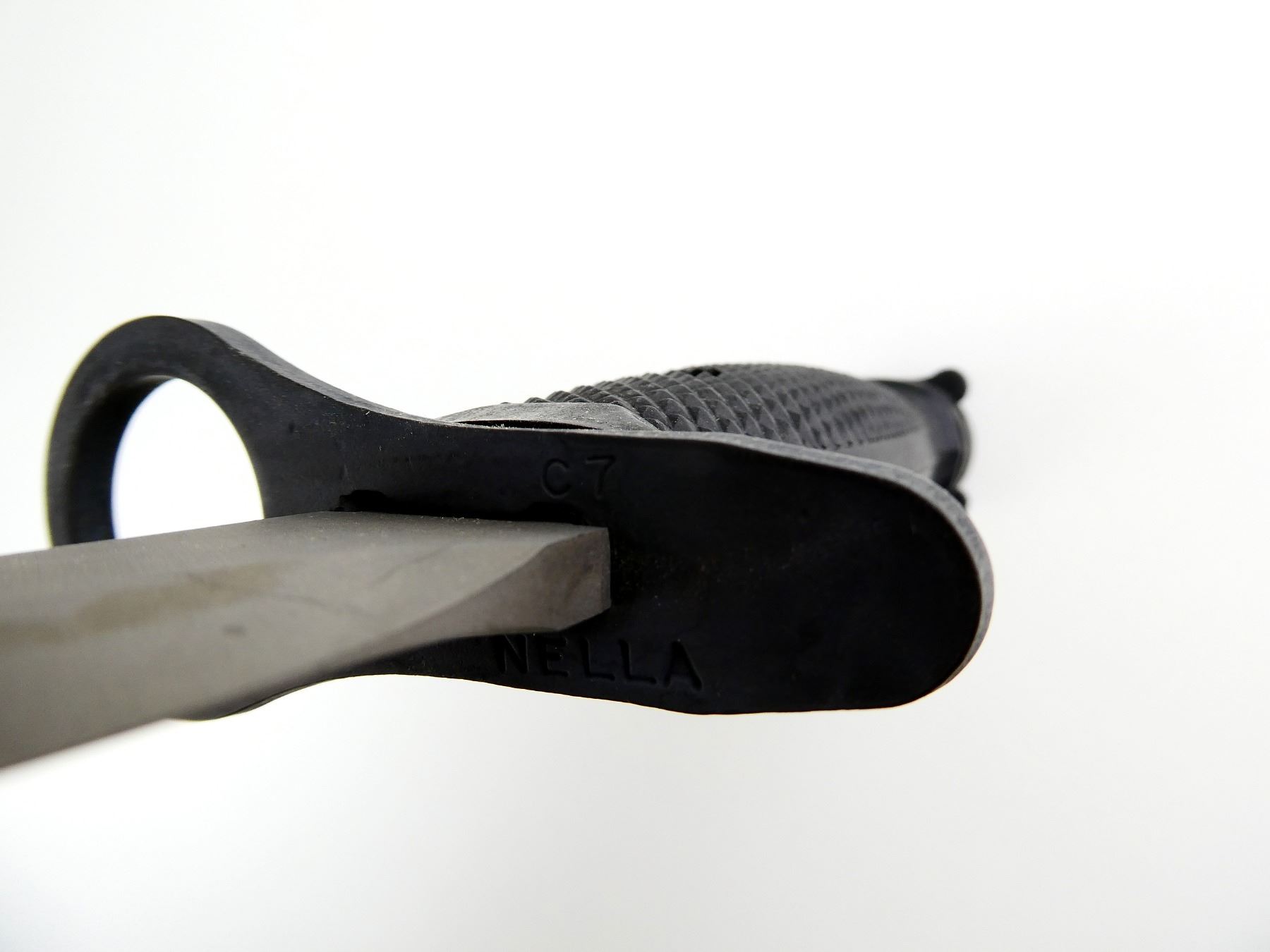 (1) FITS 5.56MM NATO C7 / C8 (M16) RIFLES, CROSS-PIECE MARKED: "C7" & "NELLA", 2-PIECE BLACK CHECKERED POLYMER GRIPS, METAL POMMEL, NO VISIBLE MARKINGS, NO SCABBARD, WITH PACKAGING, BLADE APPROX. 6.75" & OAL APPROX. 11 7/8". SEE PHOTOS.