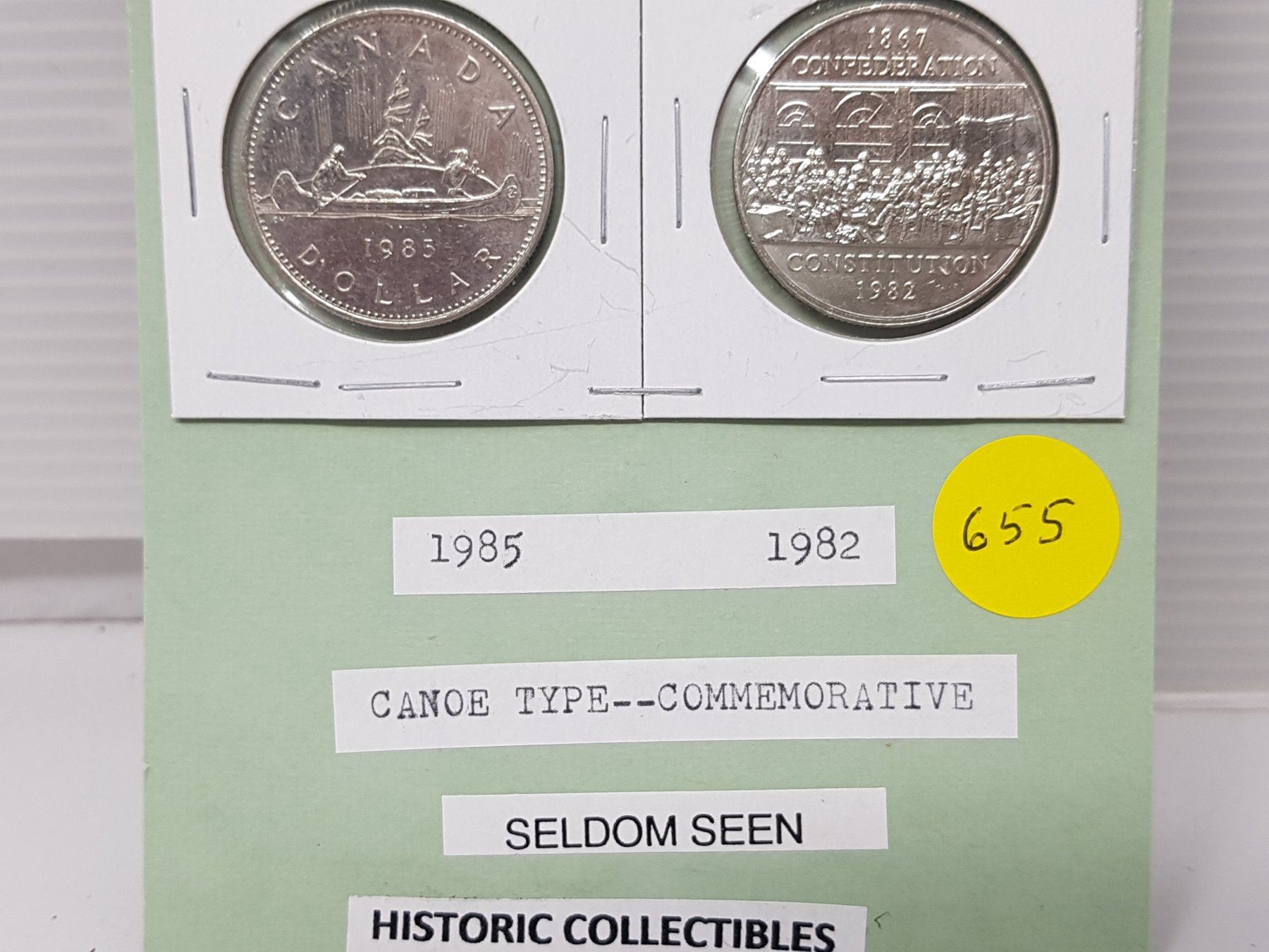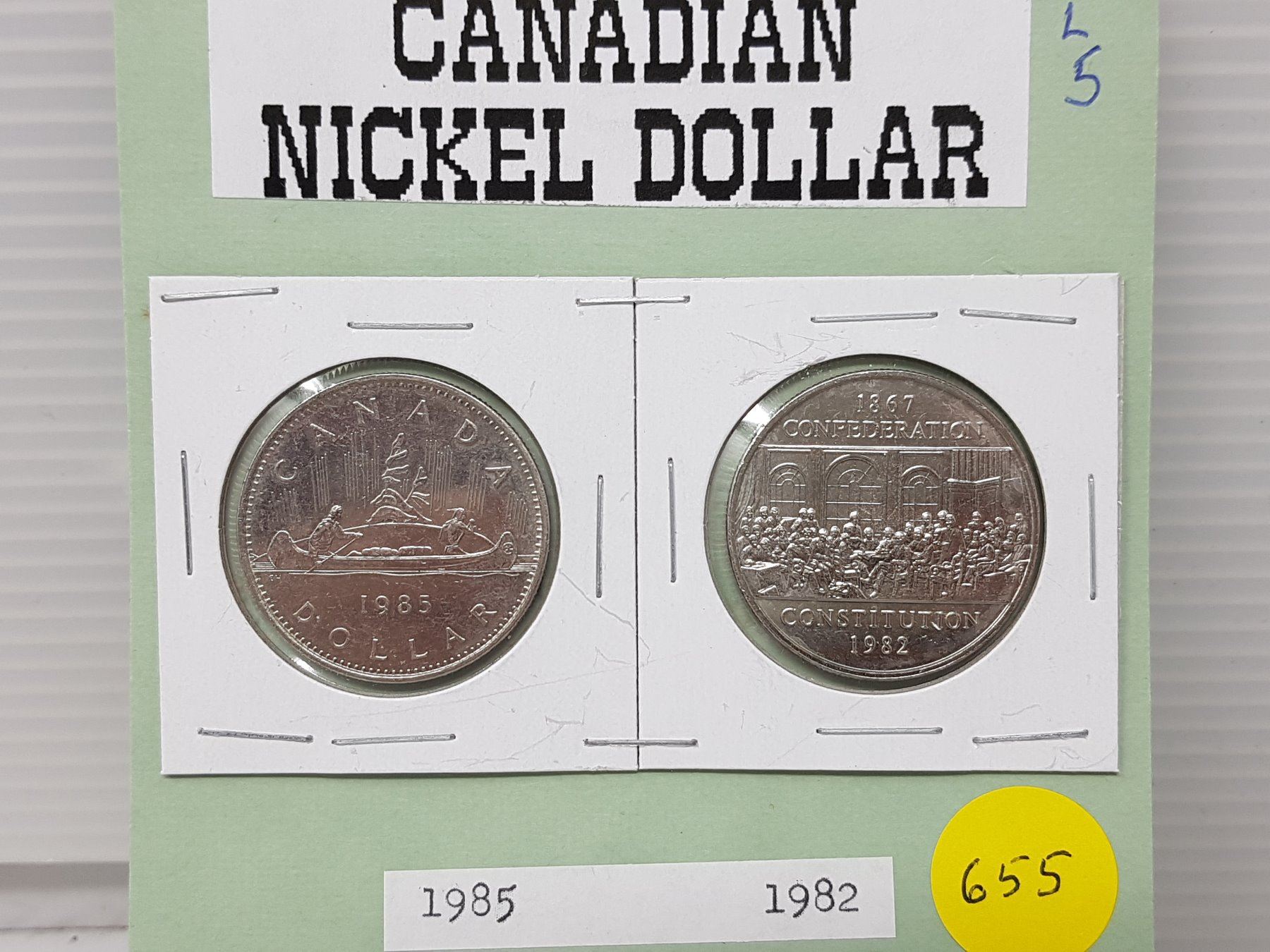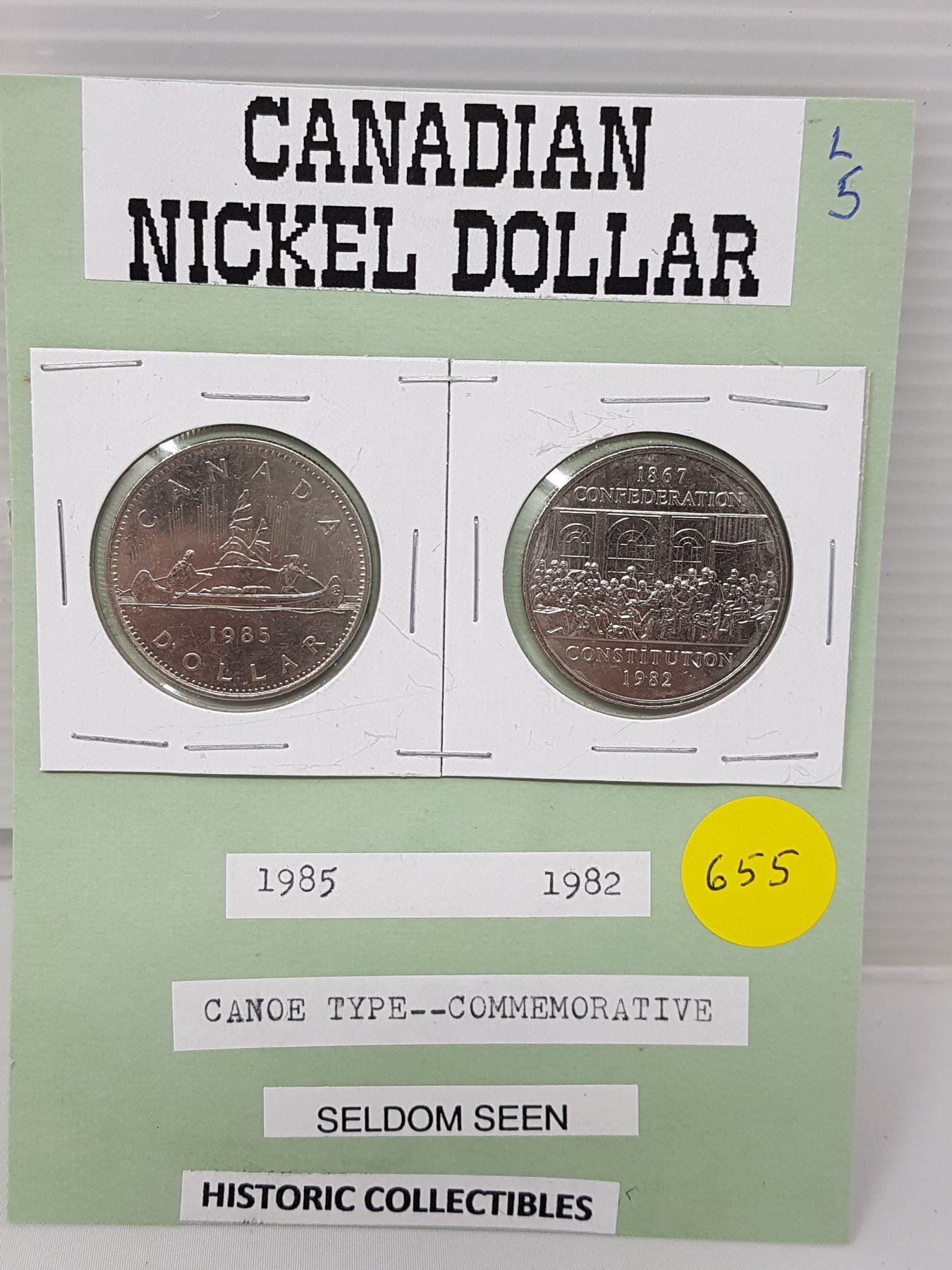 CANADIAN NICKEL DOLLARS (1985 CANOE TYPE, 1982 COMMEMORATIVE HON. CANADA'S NEW CONSTITUTION)