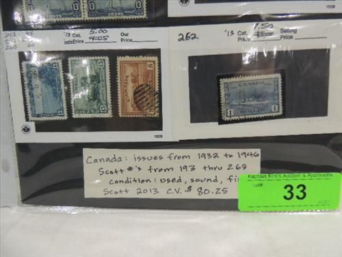 CANADIAN POSTAGE SCOTTS #193-268, 1932-46 STAMPS. CONDITION: USED, FINE. CV $80.25. AS SHOWN. VIEW PICTURE FOR DETAIL.