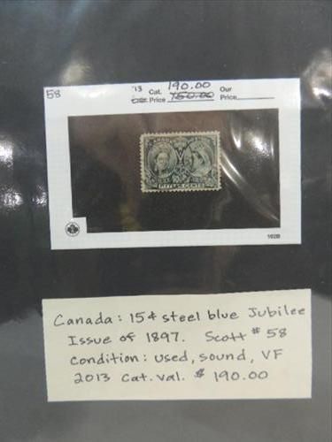 CANADIAN POSTAGE SCOTTS #58 1897 STEEL BLUE JUBILEE STAMPS ISSUE. CONDITION: USED, VF. CV $190.00. AS SHOWN. VIEW PICTURE FOR DETAIL.