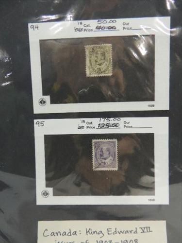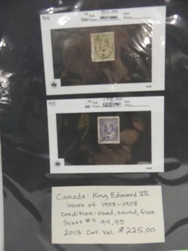 CANADIAN POSTAGE RARE SCOTTS #94 & 95 KING EDWARD STAMPS. USED 1903-08 ISSUE. CV $225.00. AS SHOWN. VIEW PICTURE FOR DETAIL.