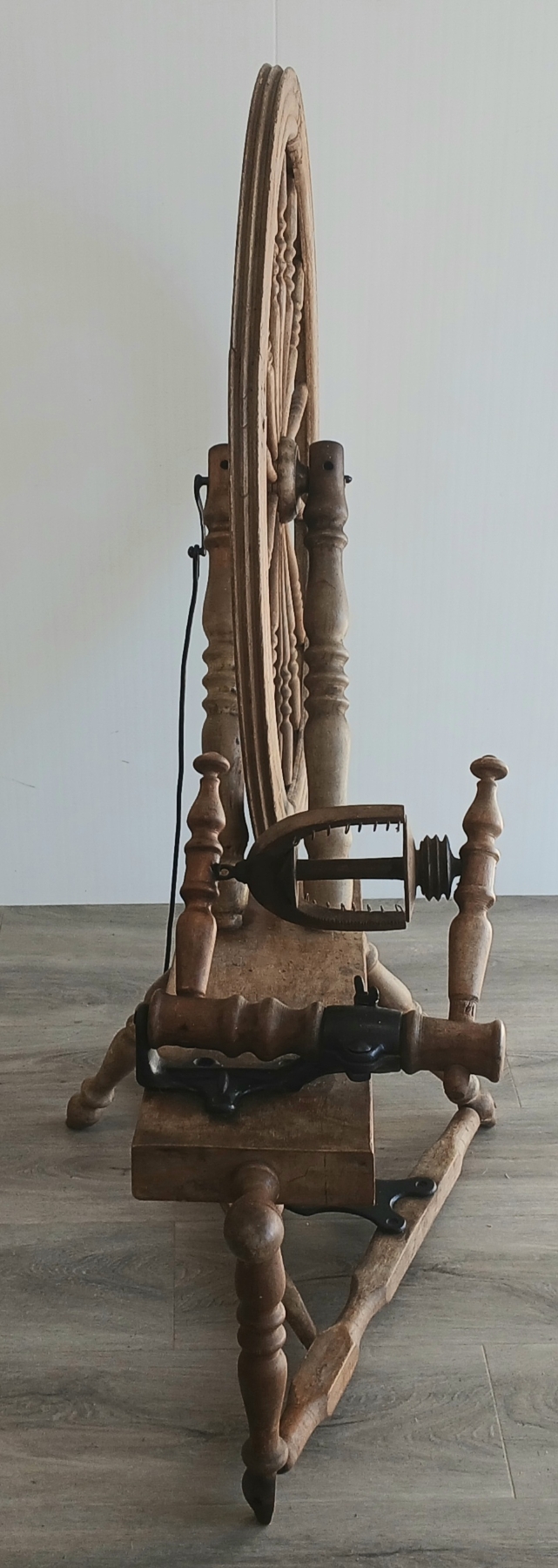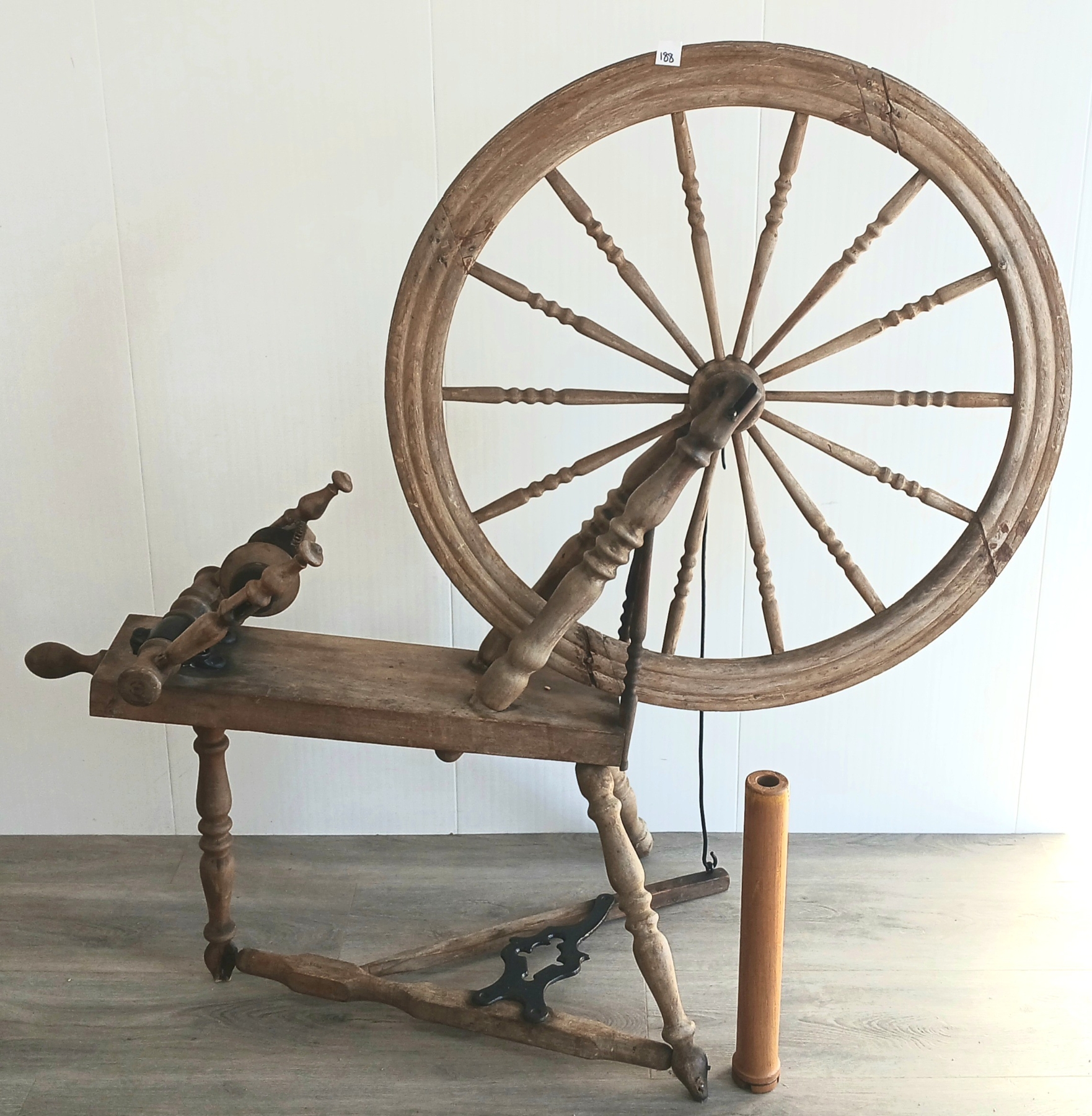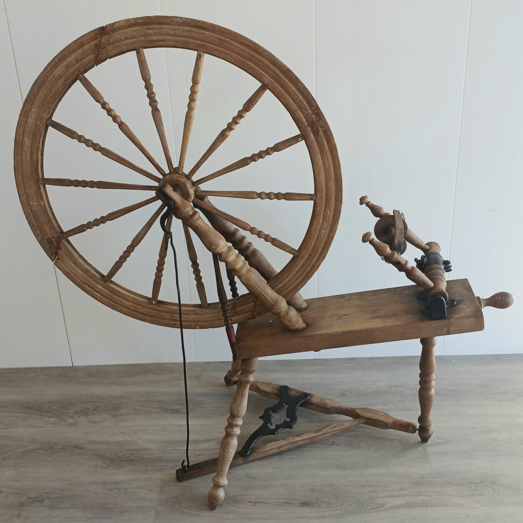 NOTE: 28IN DIA WHEEL - MISSING HOOK ON FLY - SHOWS WEAR - SEE ALL PHOTOS - INCL MILL BOBBIN