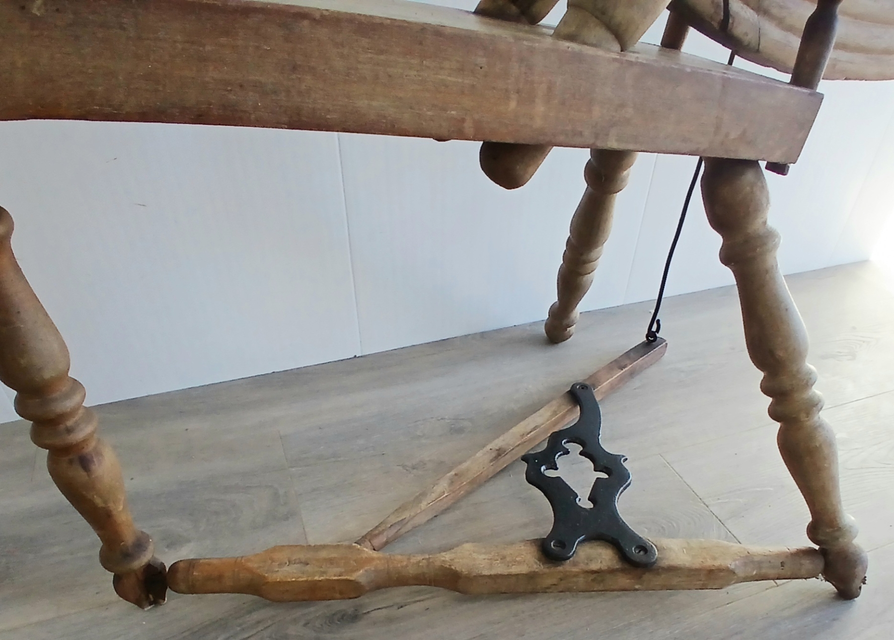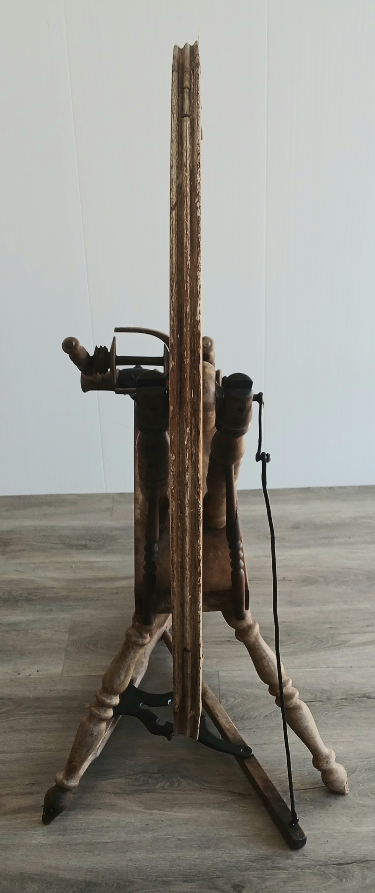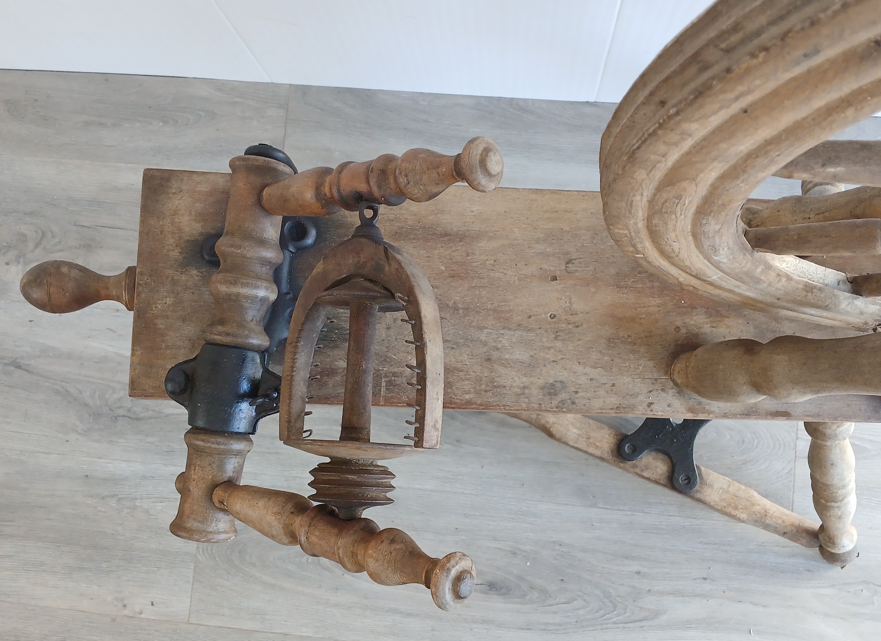 NOTE: 28IN DIA WHEEL - MISSING HOOK ON FLY - SHOWS WEAR - SEE ALL PHOTOS - INCL MILL BOBBIN