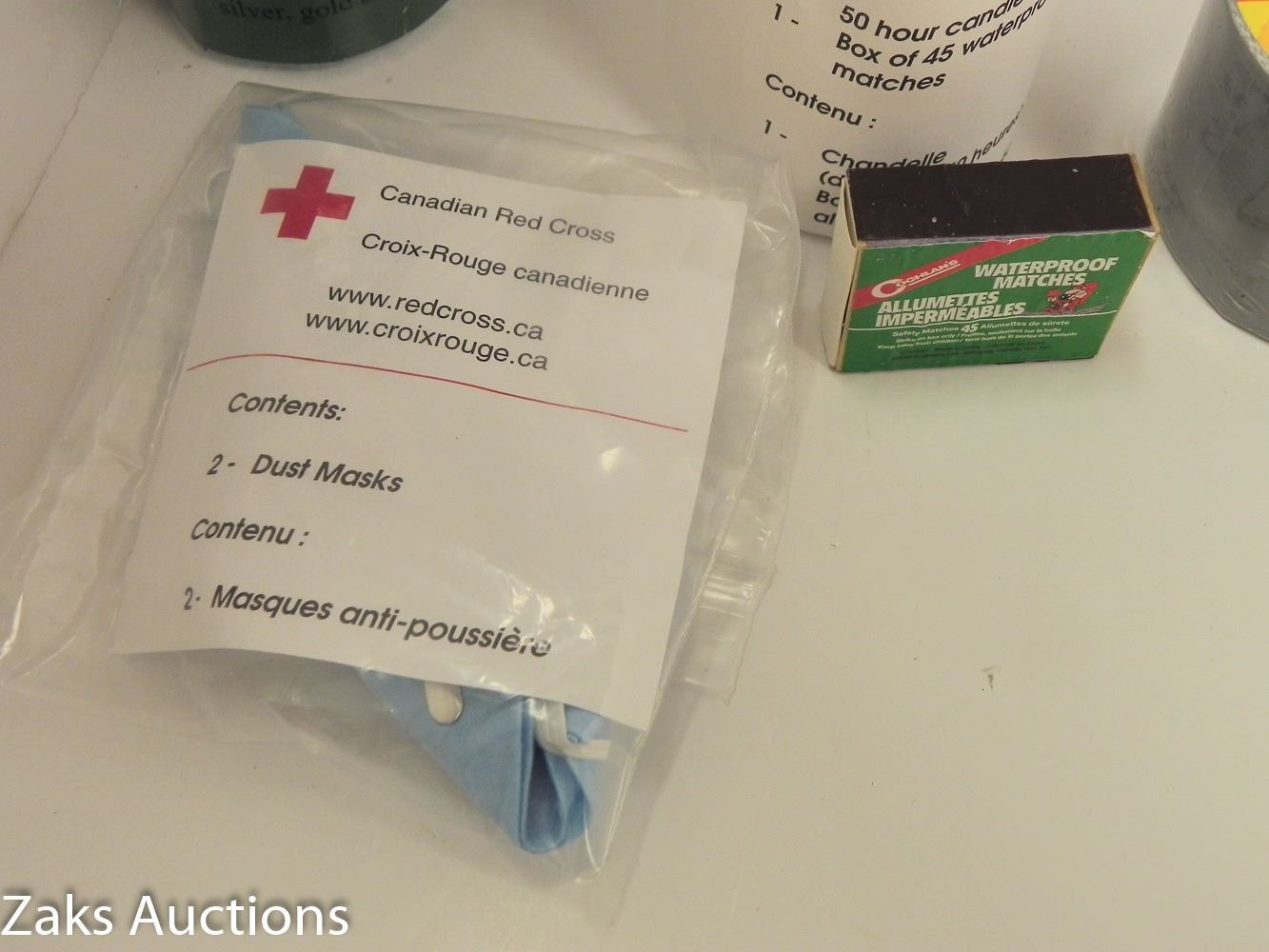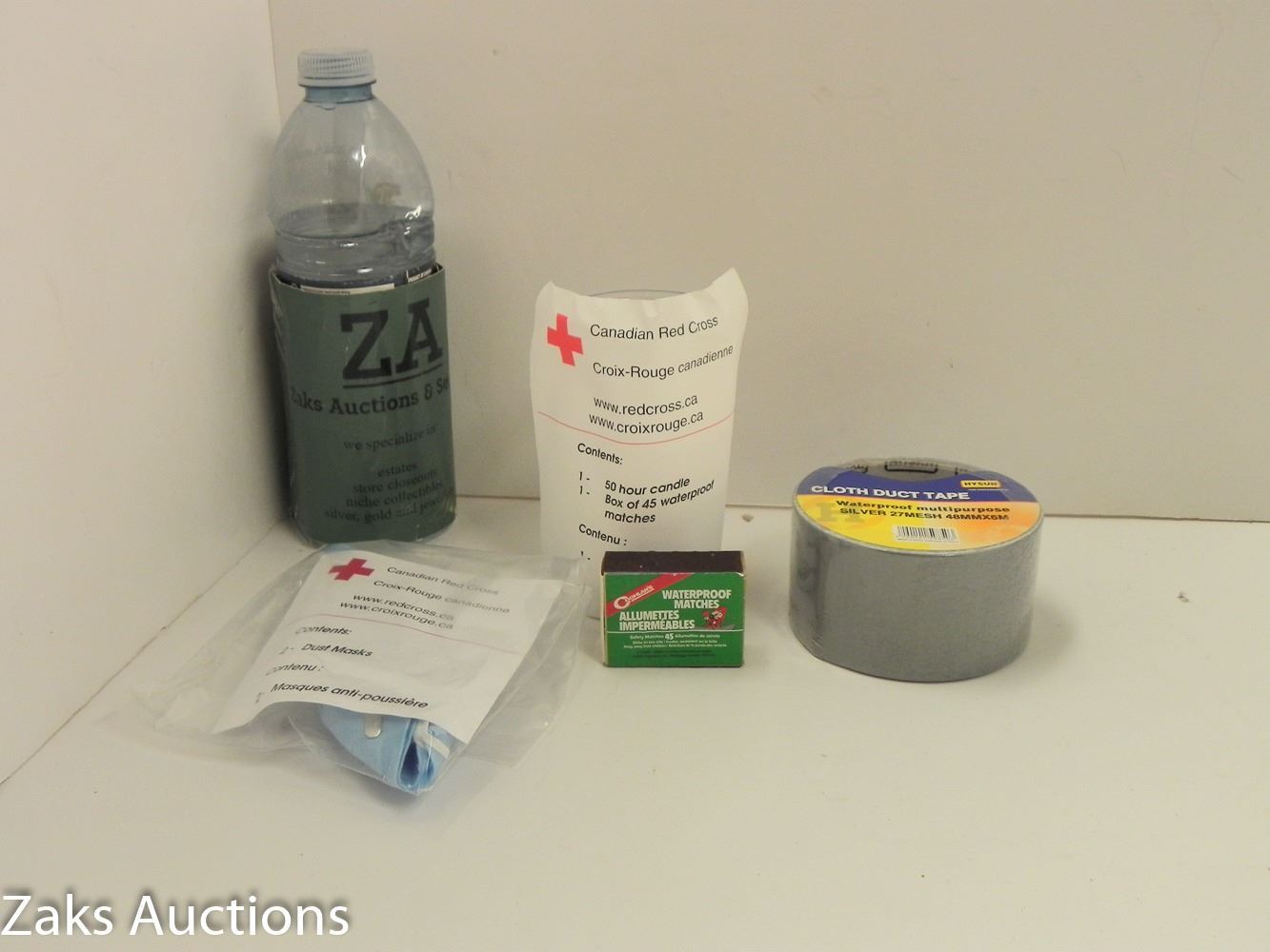 CANADIAN RED CROSS DUST MASKS, 50 HR CANDLE, WOODEN MATCHES AND CLOTH DUCT TAPE