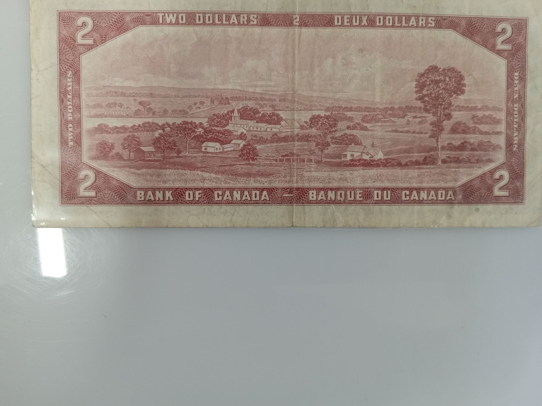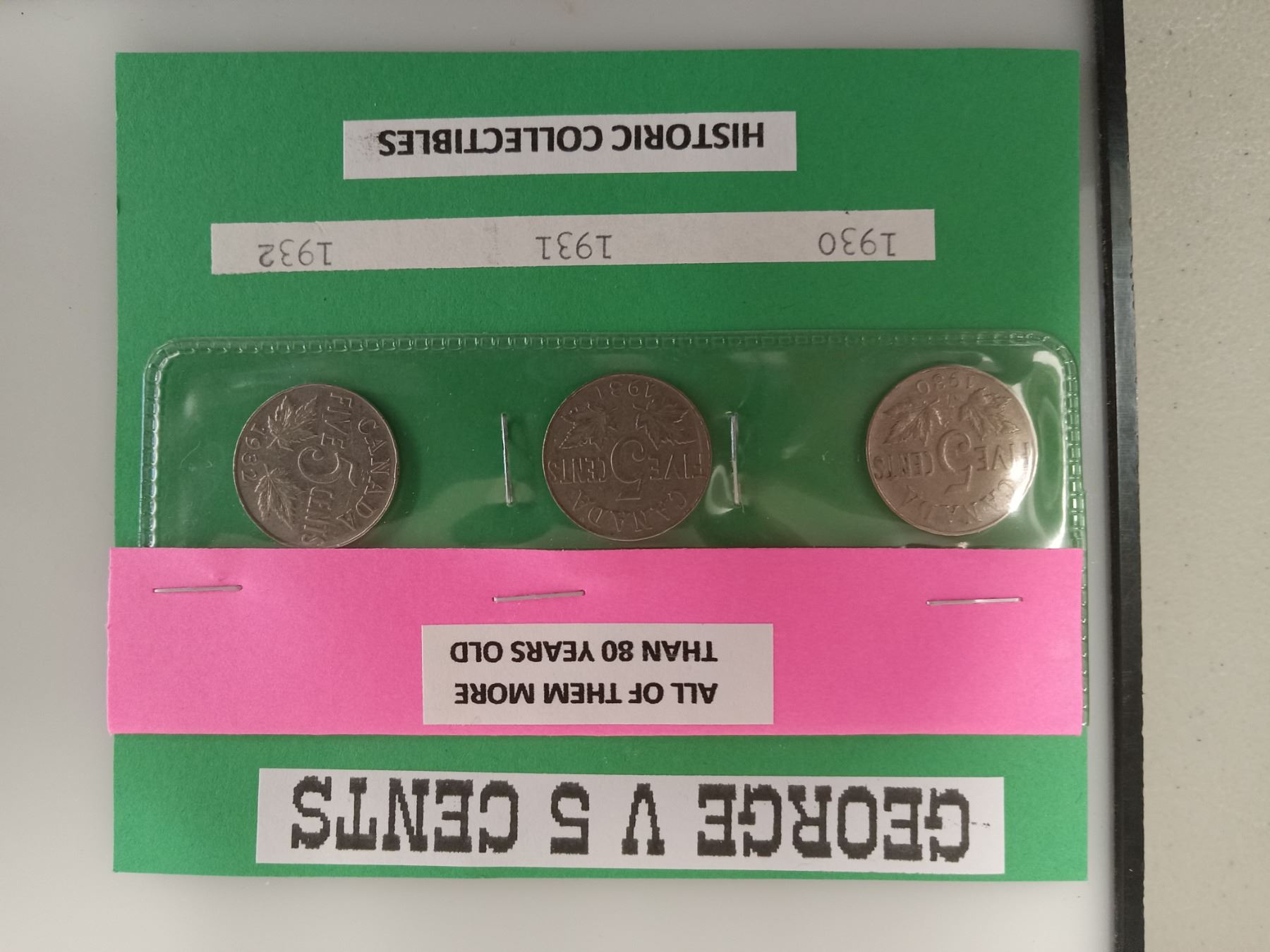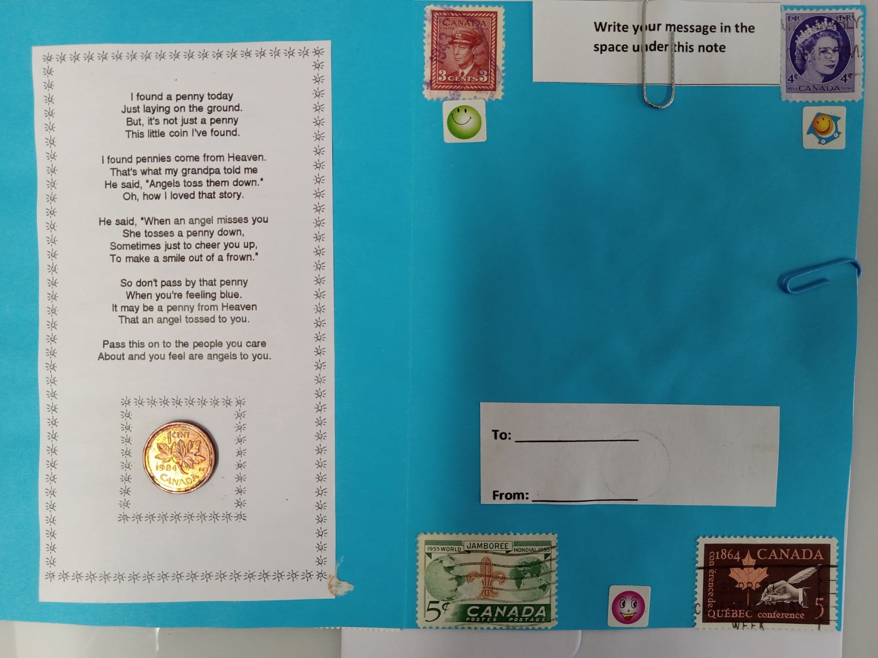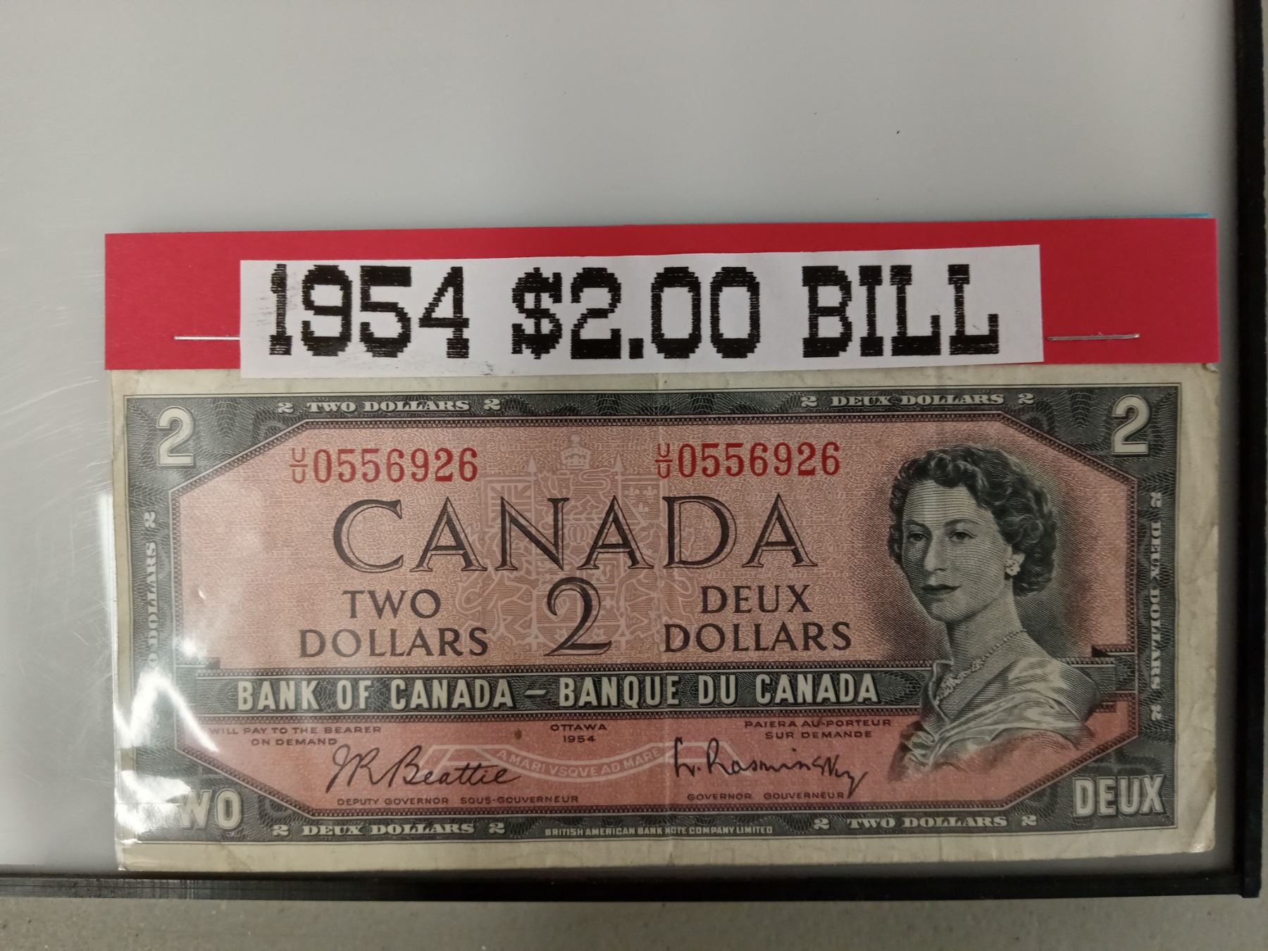 CANADIAN 'SILVER' .05 ¢ (1918, 1919) -RARE COLLECTIBLE.; GEORGE V .05 ¢ (1930, 1931, 19320); CANADIAN $2.00 (TWO DOLLAR) BANK NOTE (1954); Handcrafted STAMPS FACED Gift Card W/ LUCKY PENNY(30+ Stamps).