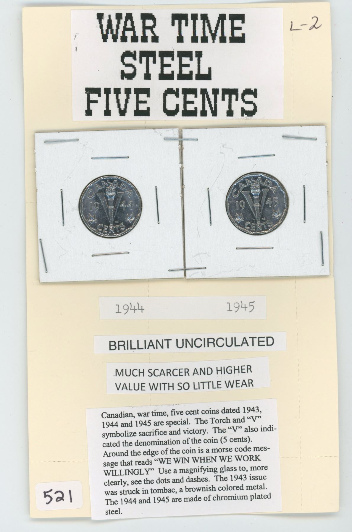 CANADIAN VICTORY 5 CENT 1944 & 1945 BRILLIANT UNC.-MUCH SCARCER-NICE CONDITION