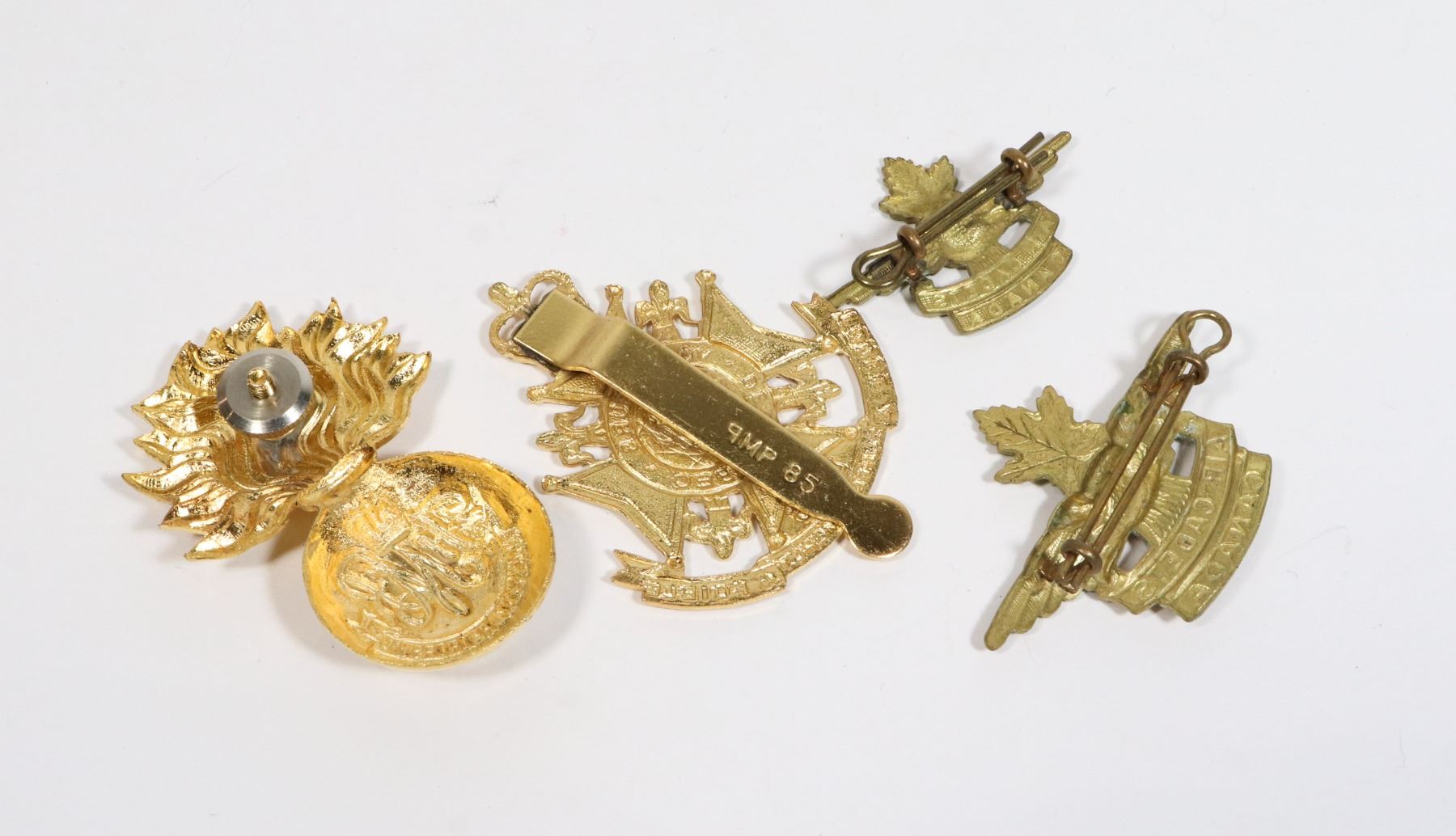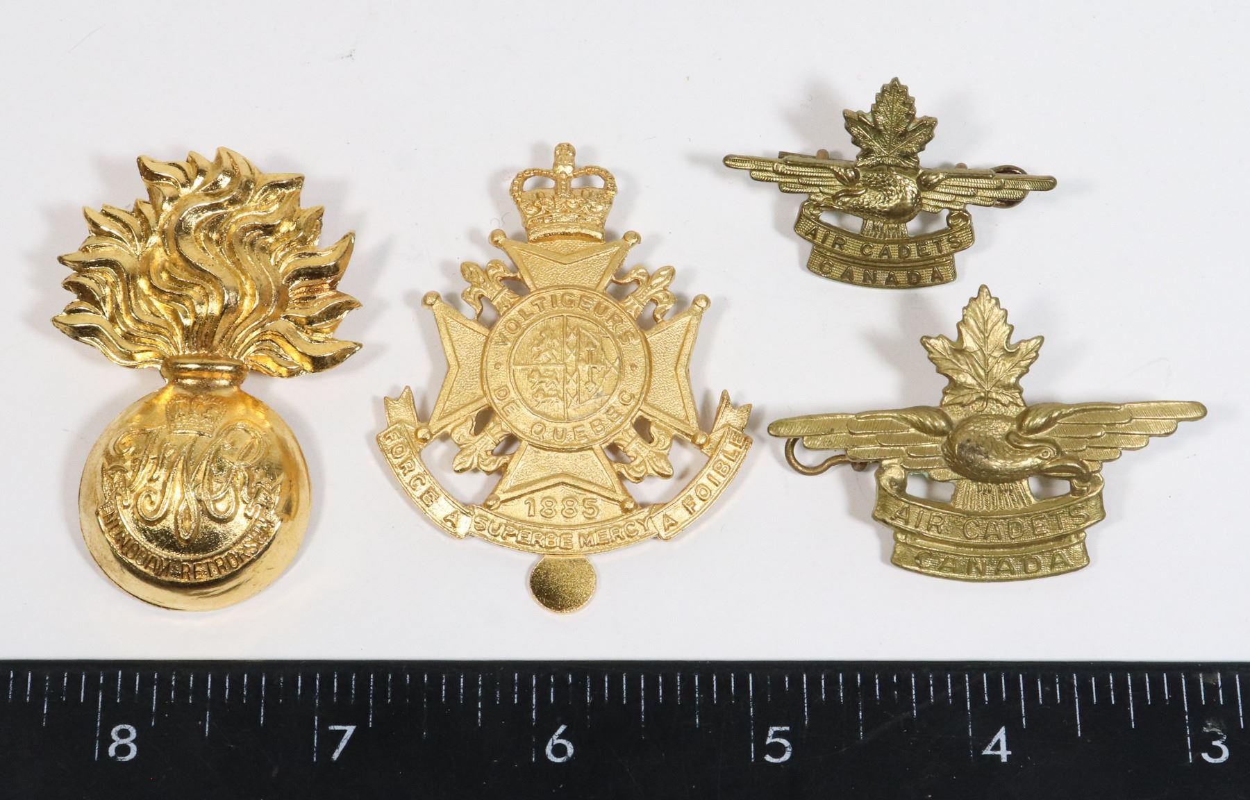 PRESSED METAL PRODUCTS 85 PMP MARKED AND FUSILIERS MONT- ROYAL FRENCH CANADIEN CANADIAN CANADA MILITARY ARMY COLD WAR ERA QUEEN ELIZABETH II QEII CAP BADGE, AND CANADA CANADIAN AIR CADETS CAP BADGE AND COLLAR BADGE CANADIAN CANADA ALLIED FORCES MILITARY INSIGNIA