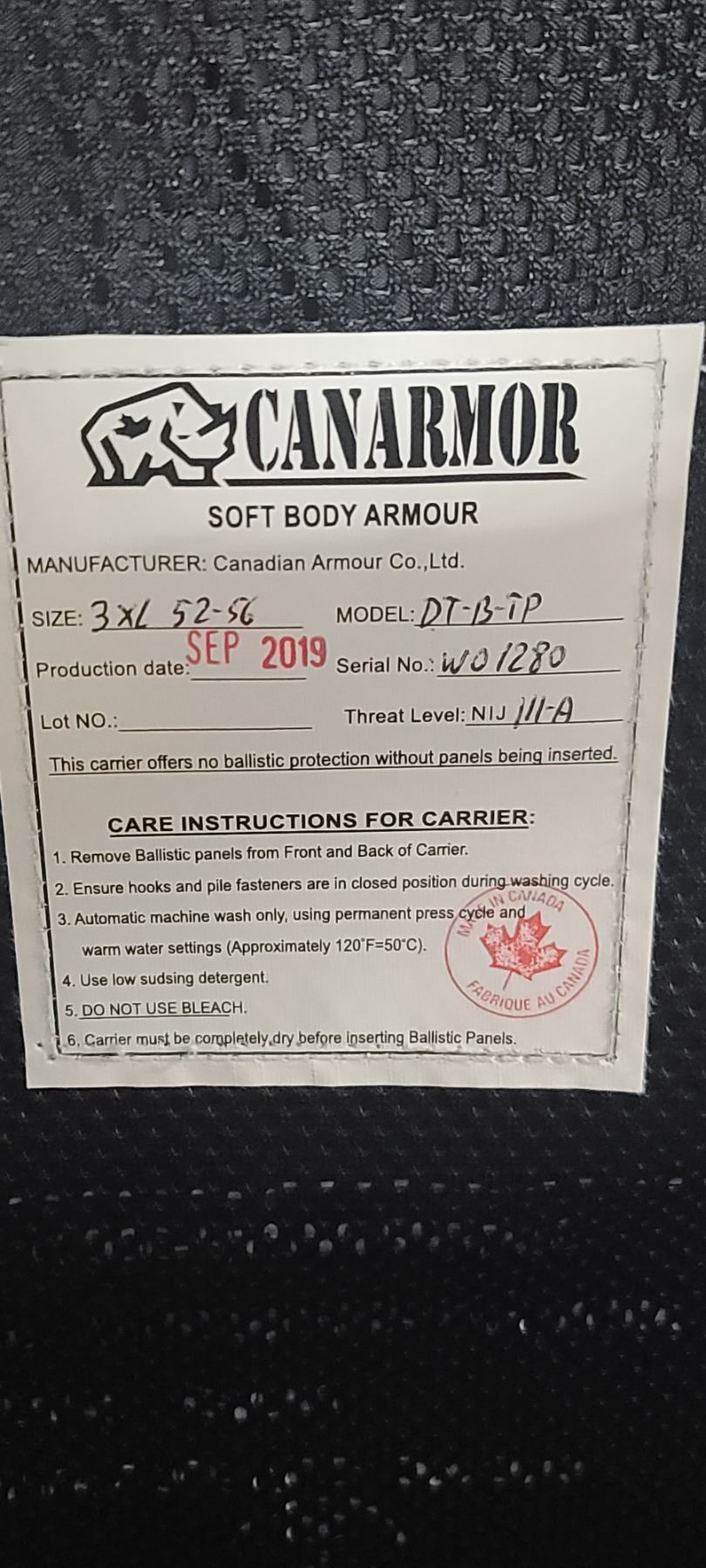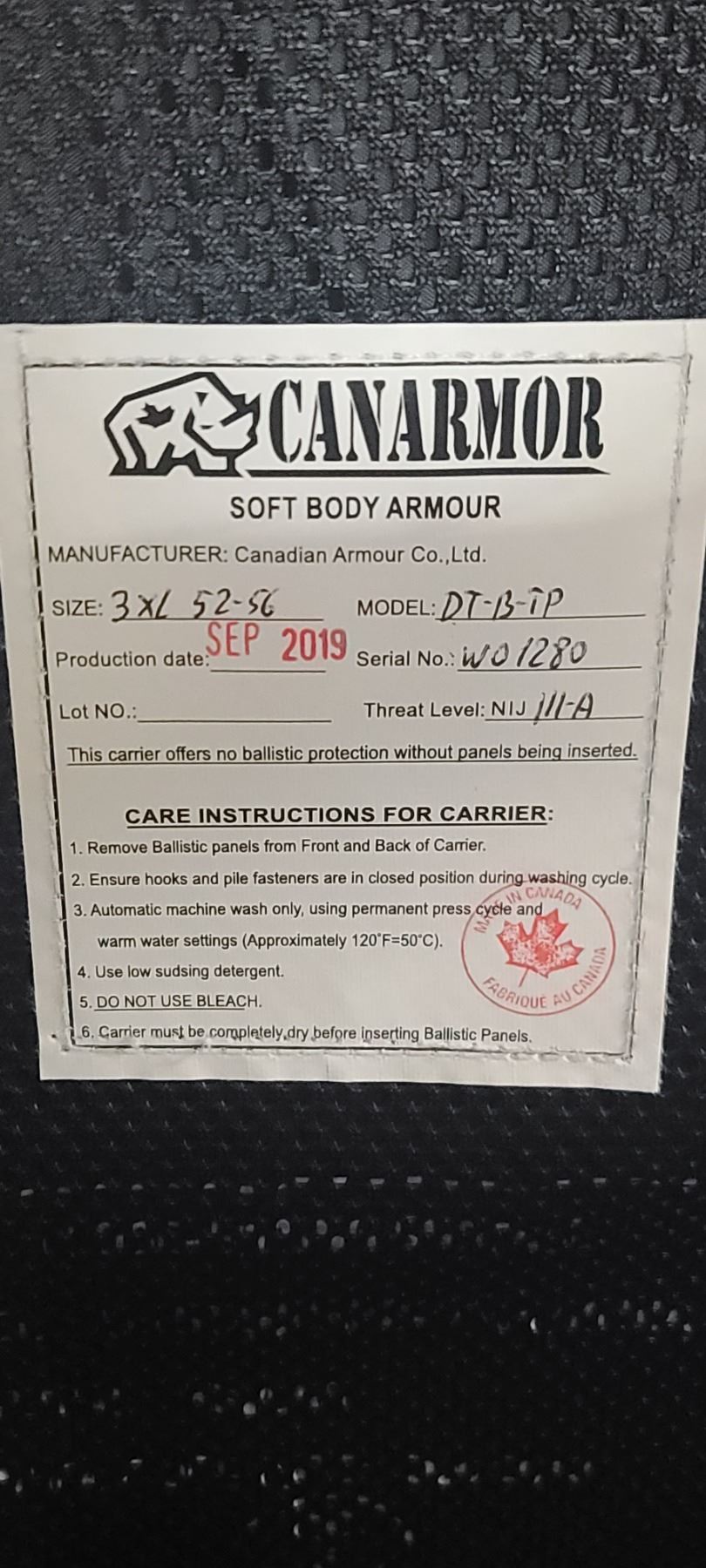 CANARMOR SOFT BODY ARMOUR - THREAT LEVEL: NI J IIIA KEVLAR SIZE 3XL52 -56 PLATES AND VETS