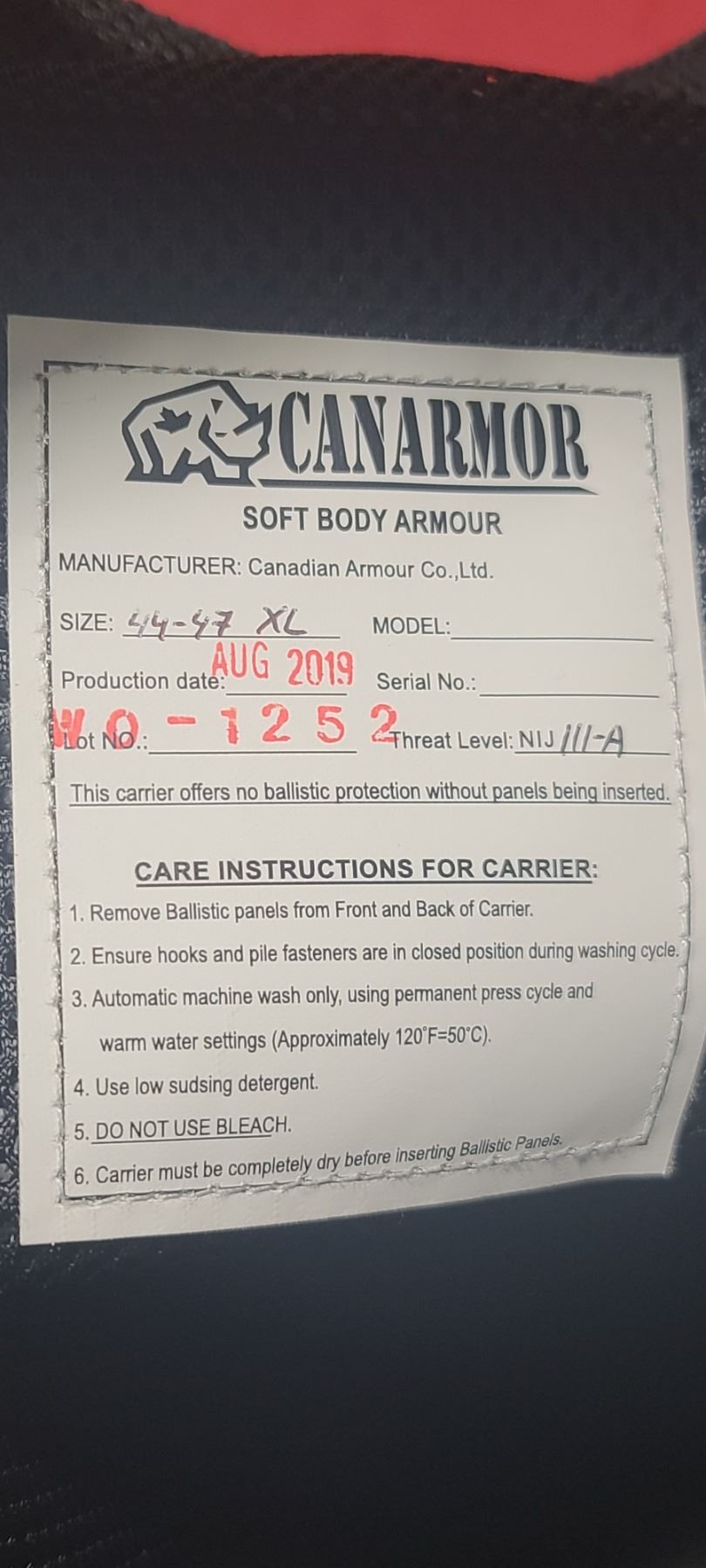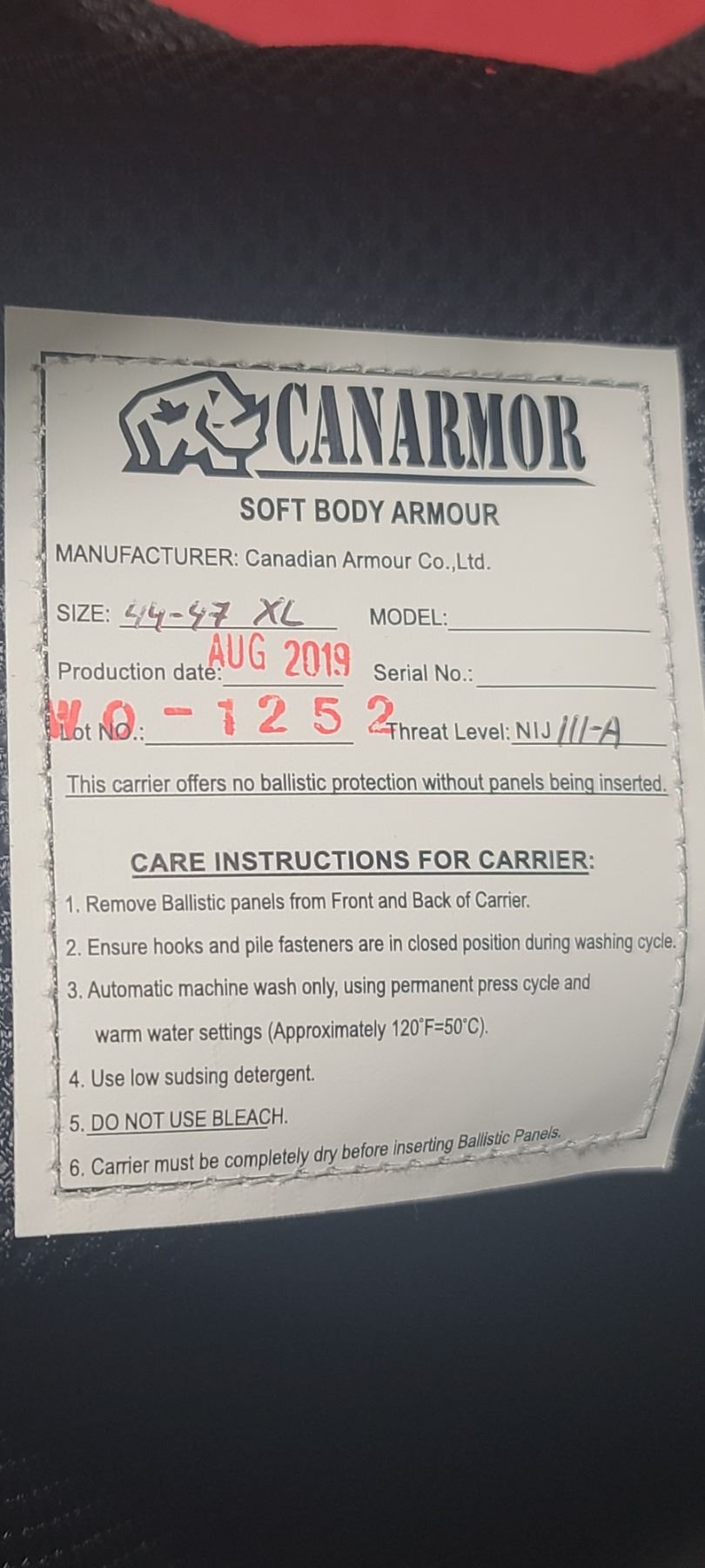 CANARMOR SOFT BODY ARMOUR - THREAT LEVEL: NI J IIIA KEVLAR SIZE 44-47 XL PLATES AND VETS