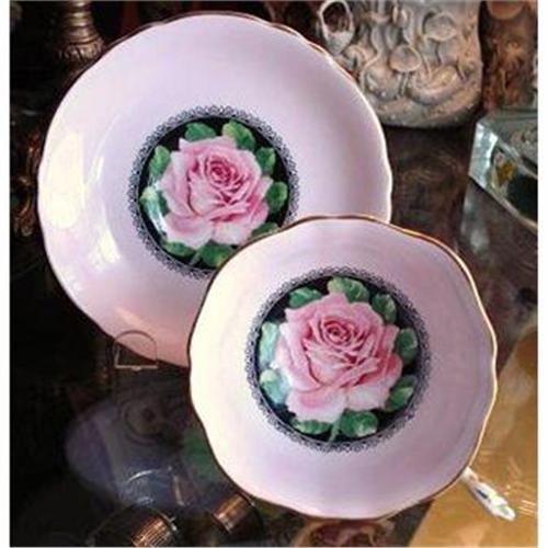 FABULOUS ONE OF THE KIND CUP AND SAUCER SET, MADE BY PARAGON OF ENGLAND, DECORATED IN CANDY PINK BACGROUND COLOR AND SHOWING ONE LARGE PINK ROSE AGANST THE BLACK GROUND,MOST BEAUTIFUL SET THAT SERIOUS COLLECTOR WOULD BE PROUD TO OWN IT, EXCELLENT CONDITION, US BUYER TO PAY 7.00 FOR SHIPPING PLUS INSURANCE.THANKS.