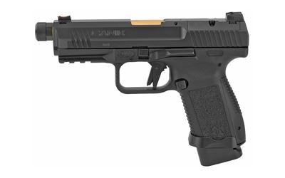 CANIK, TP9SF Combat Executive, Striker Fired, 9MM, 4.73" Salient PVD Gold Finish Threaded Barrel, Polymer Frame, Aluminum Speed Funnel Mag Well, Black Finish, Fiber Optic Front Sight, Optics Ready Slide with 1 Adapter Plate, Charging Handle, 1 15Rd and 1 18Rd Magazine