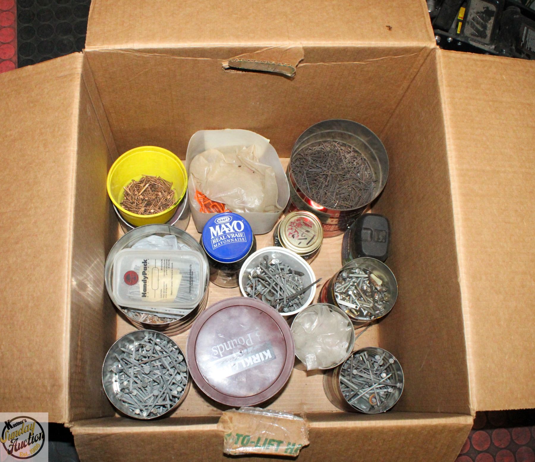CANS OF VARIOUS NAILS, BOLTS, SCREWS