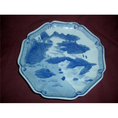 BLUE & WHITE CANTON BOWL 19th DEPICTS MEN FISHING & WORKING THE LAND NEAR A LAKE OR RIVER CONDITION IS FINE