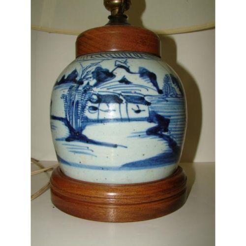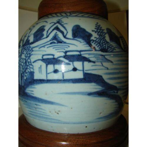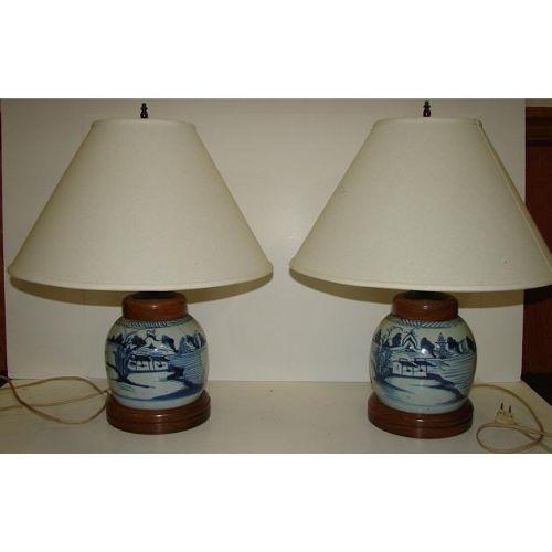 PAIR OF CANTON TABLE LAMPS. Consists of a pair of Canton ovoid jars with blue boat and shoreline decorations that have been converted into lamps. One jar shows severe cracking throughout. Electrified. 19.5” H