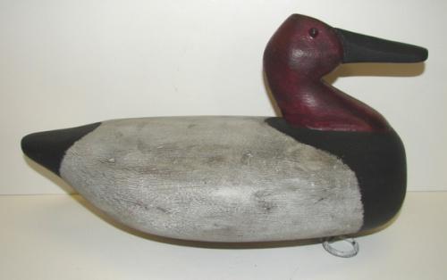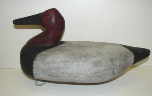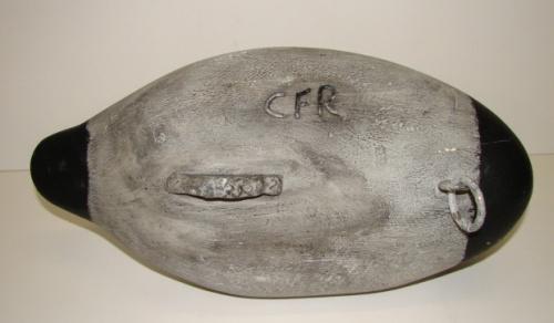 CANVASBACK DECOY. Carved from cedar in primitive style. Marked on bottom "CFR". Has lead weight on bottom. Has tack eyes.