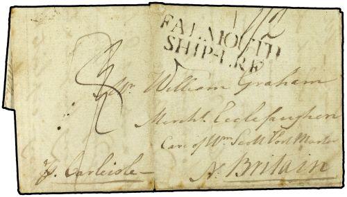 1789 (Dec 19) Entire letter written by Thomas Graham addressed to care of W. Scott, Postmaster, Carlisle from the Island St. Jago. Struck with fine two line ´Falmouth/Ship-Lre´ in black with additional ½d. charged in manuscript. Long letter with complete transcript enclosed (leaving for Lisbon in two days, cruising the coast of Africa abd returning via Fayal). A fascinating and very rare entire letter: Thomas Graham (photo enclosed with lot) served with Admiral Nelson and died in 1811.