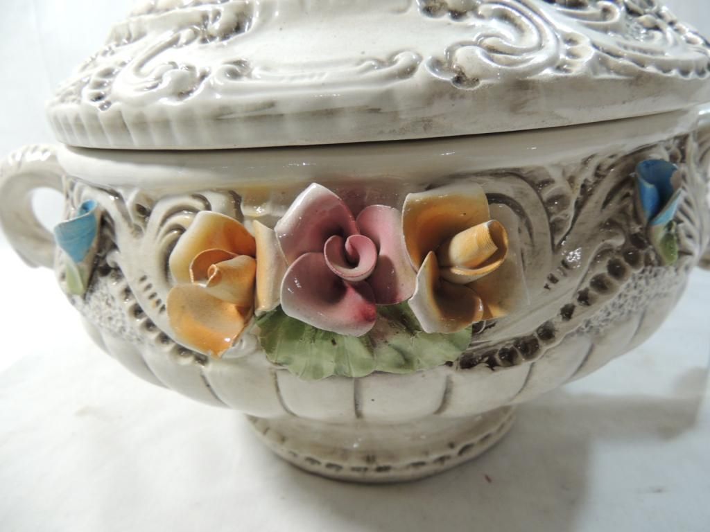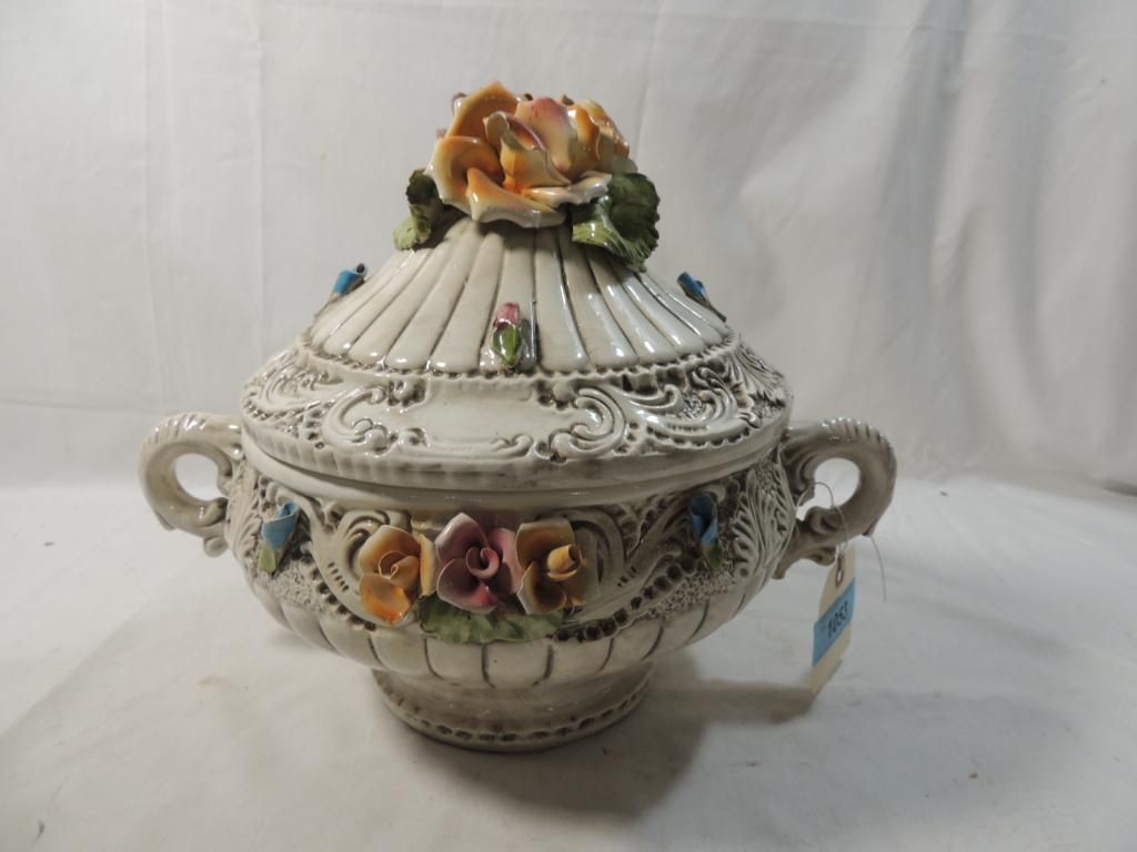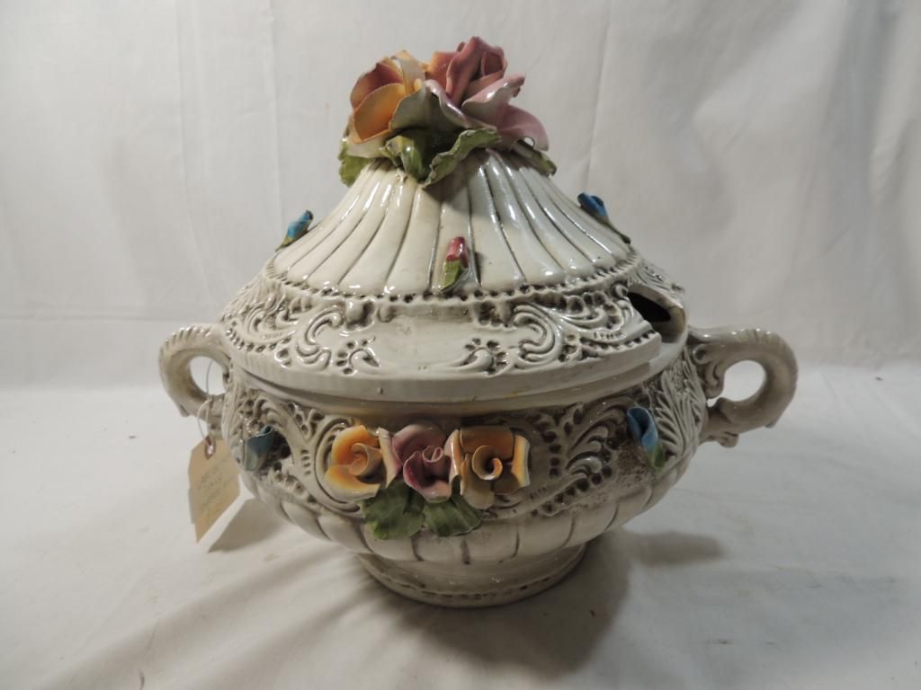 CAPODIMONTE COVERED DISH ITALY FLOWER VINTAGE PORCELAIN FLORAL COVERED BOWL
