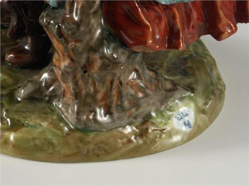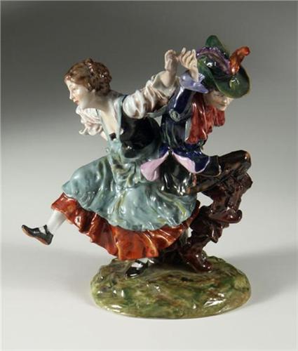 PORCELAIN: A Capodimonte porcelain figurine, hallmarked with blue ''N'' and crown on base, additional illegible mark on underside, a polychrome dancing couple, a jester and a young maiden, 9'' x 7'', no damage noted.