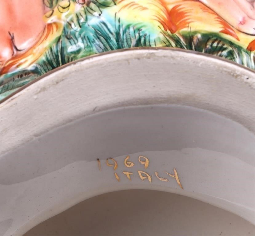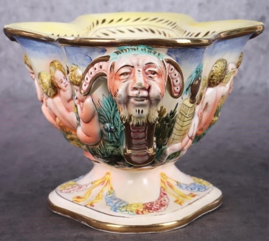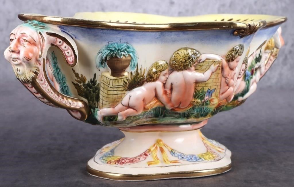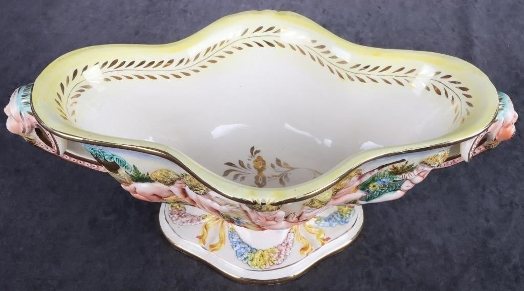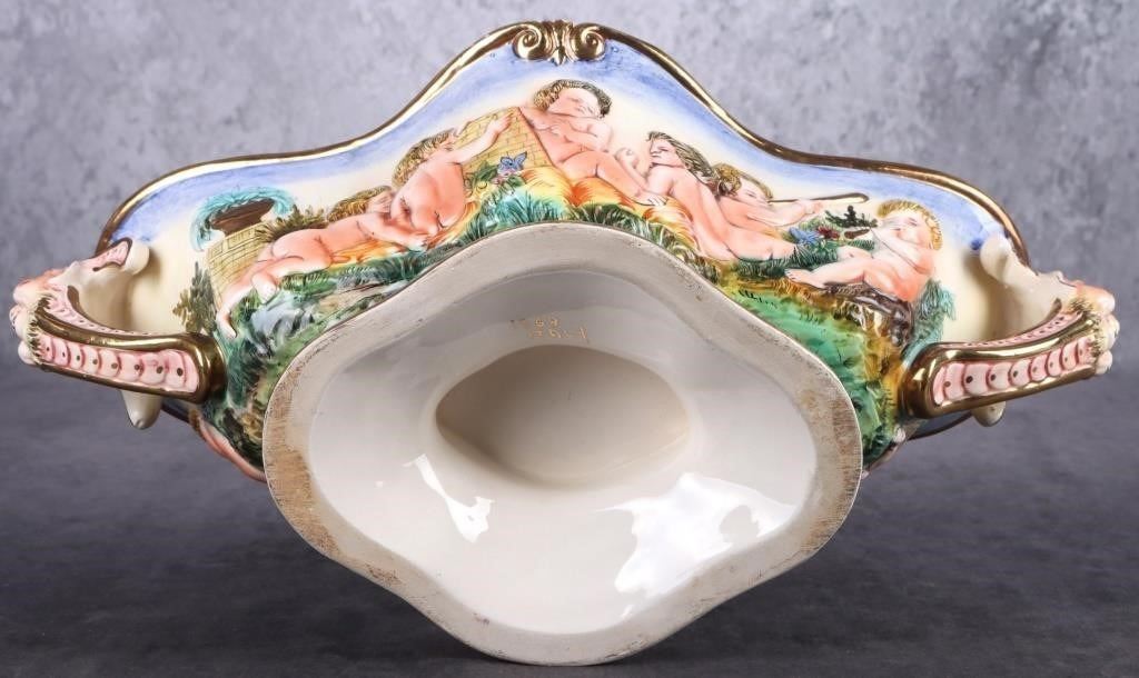 Capodimonte large centerpiece bowl from Italy adorned with cherubs. This bowl could possibly be a part of the Royal Collection. This bowl is beautifully done. The colors are very vibrant and show the amazing details.