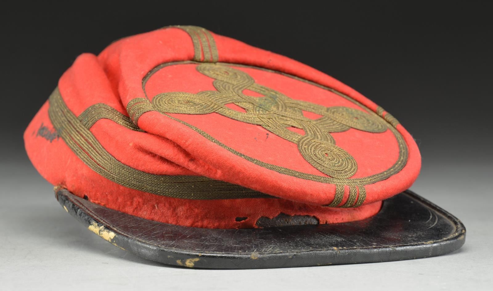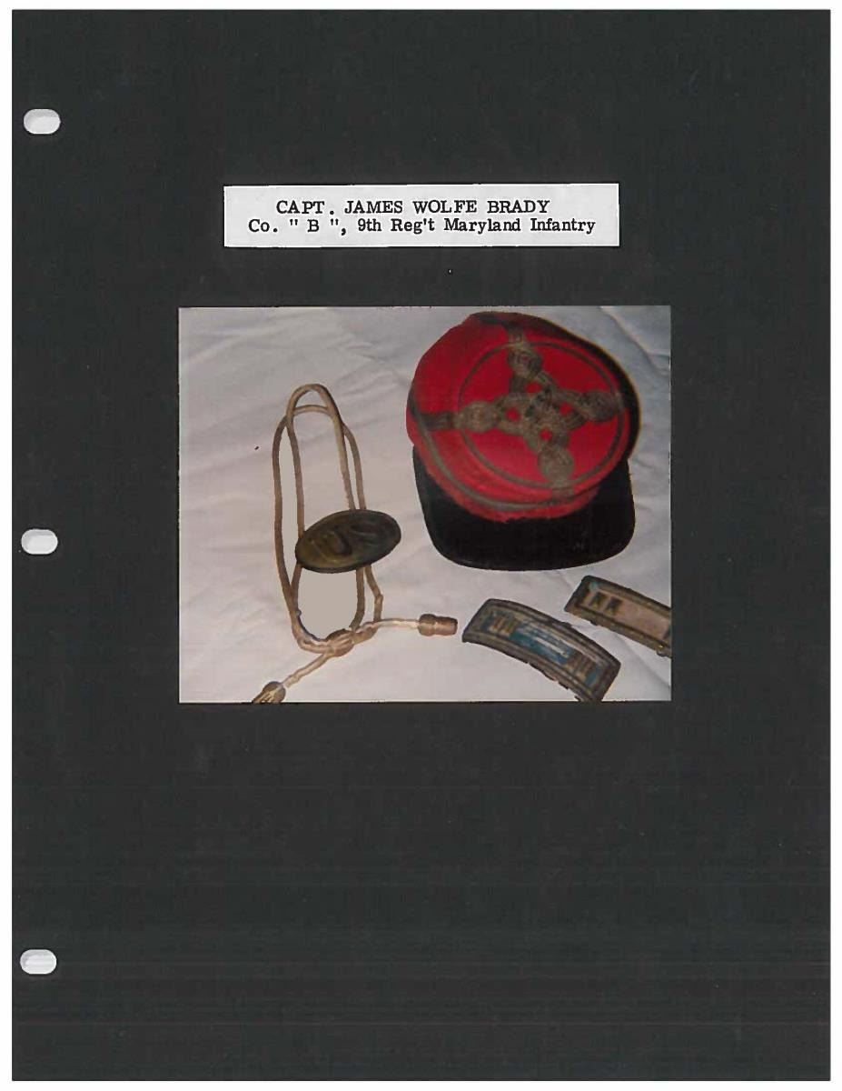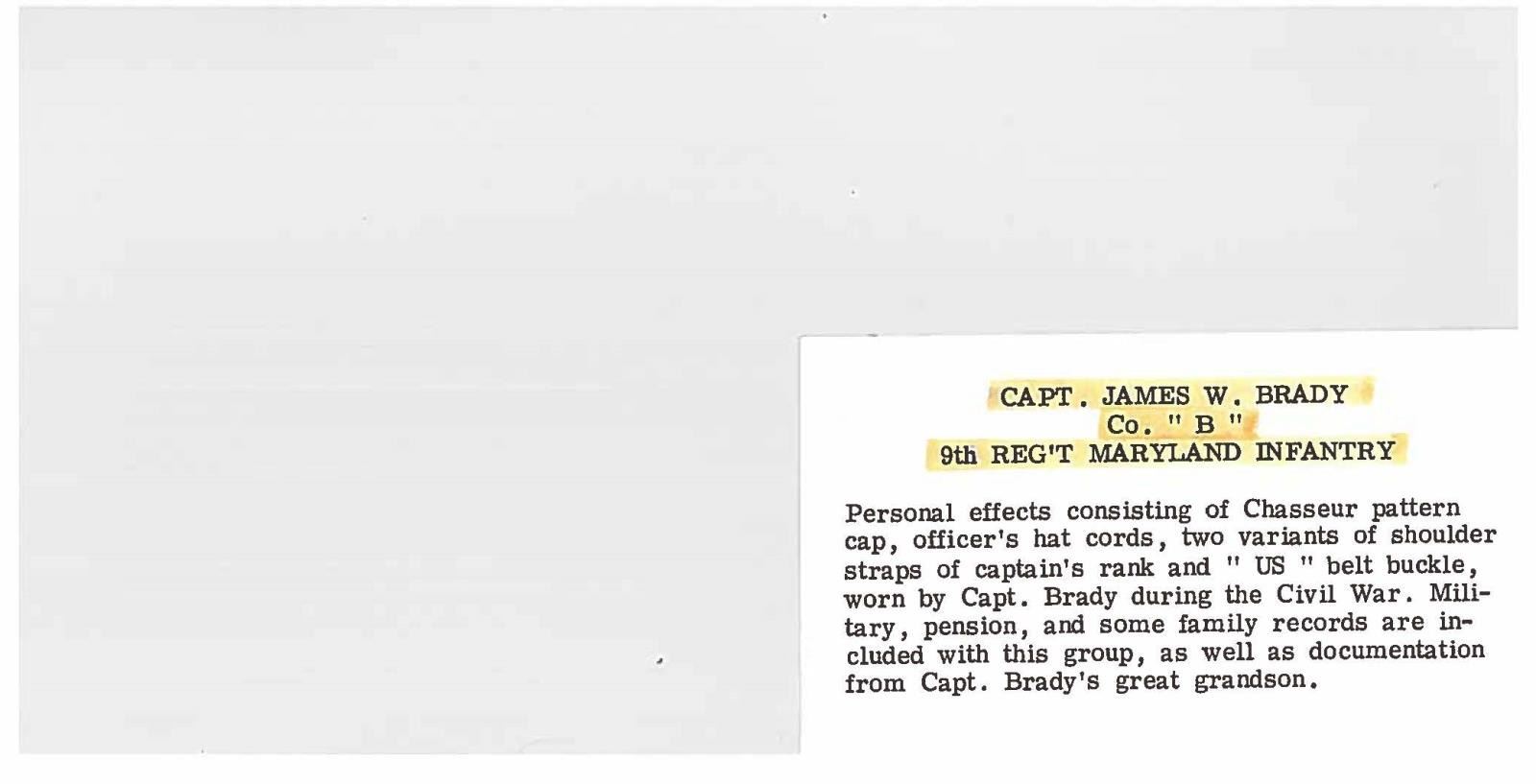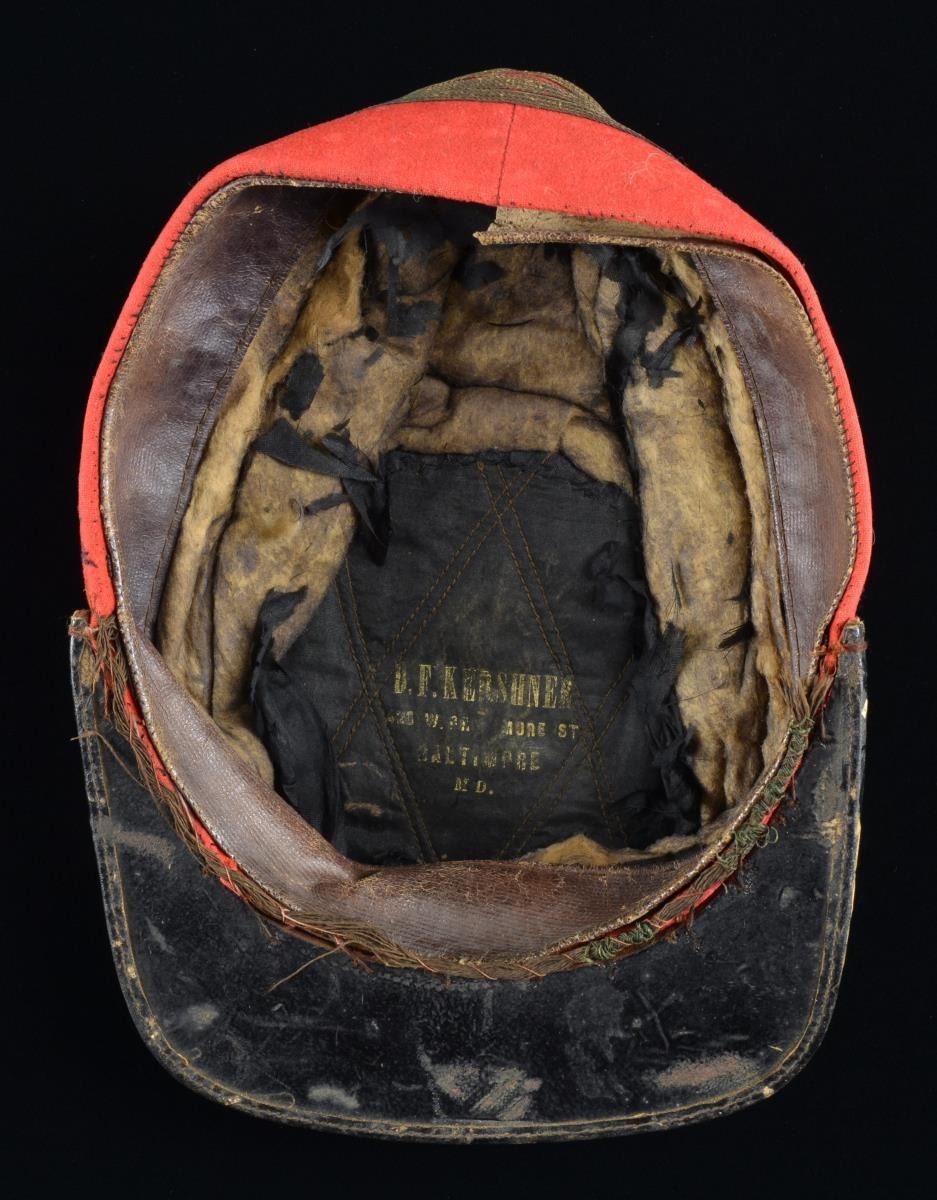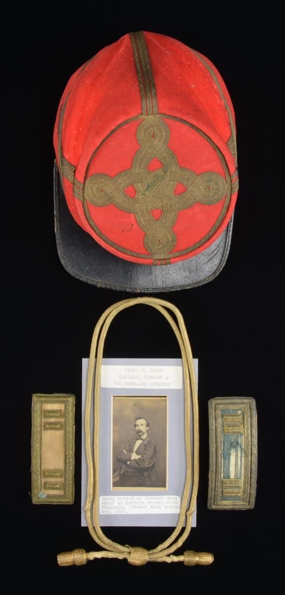 Rare red quatrefoiled Baltimore made cap is from direct descent of James Brady family with signed affidavit from great grandson. Other personal affects include 2 captain's Smith patent shoulder straps, hat cord (GAR), patent papers, and copies of family letters, newspaper obituary. There is also included a fine CDV of Brady with ink inscription. This grouping was part of the late Arthur “Gil” Barrett and he displayed this as part of his Maryland collection for many years.