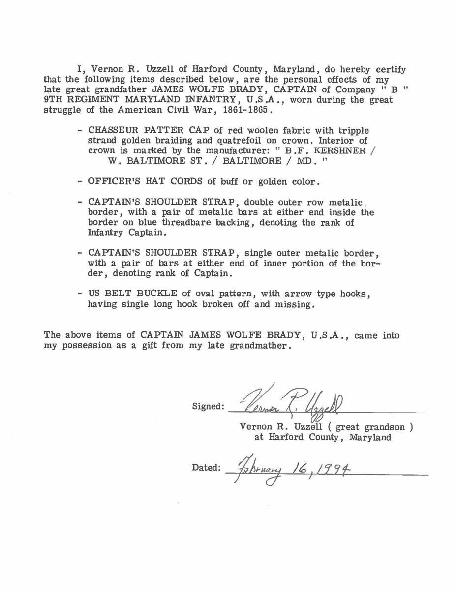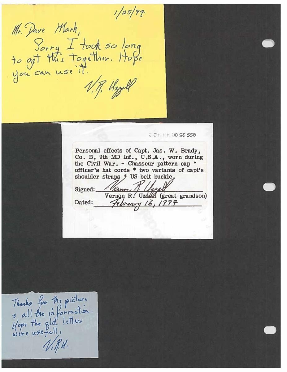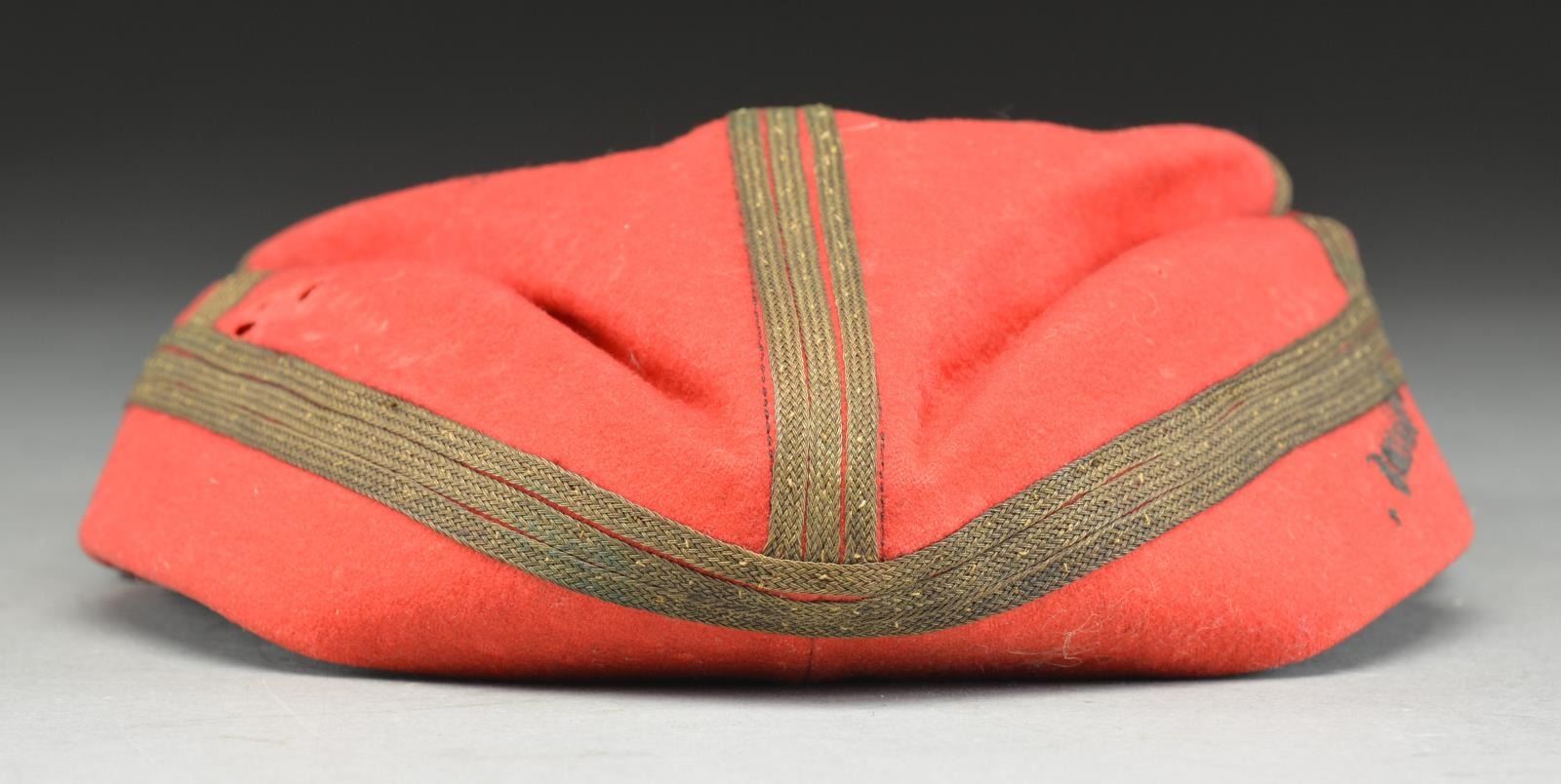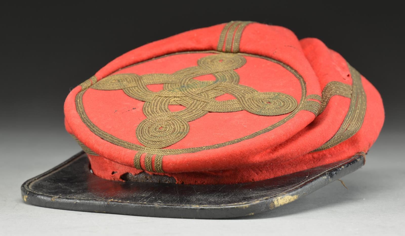 Rare red quatrefoiled Baltimore made cap is from direct descent of James Brady family with signed affidavit from great grandson. Other personal affects include 2 captain's Smith patent shoulder straps, hat cord (GAR), patent papers, and copies of family letters, newspaper obituary. There is also included a fine CDV of Brady with ink inscription. This grouping was part of the late Arthur “Gil” Barrett and he displayed this as part of his Maryland collection for many years.