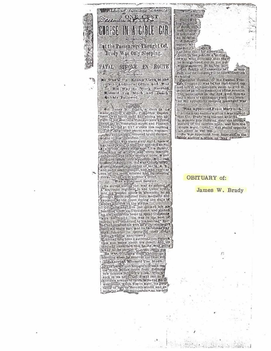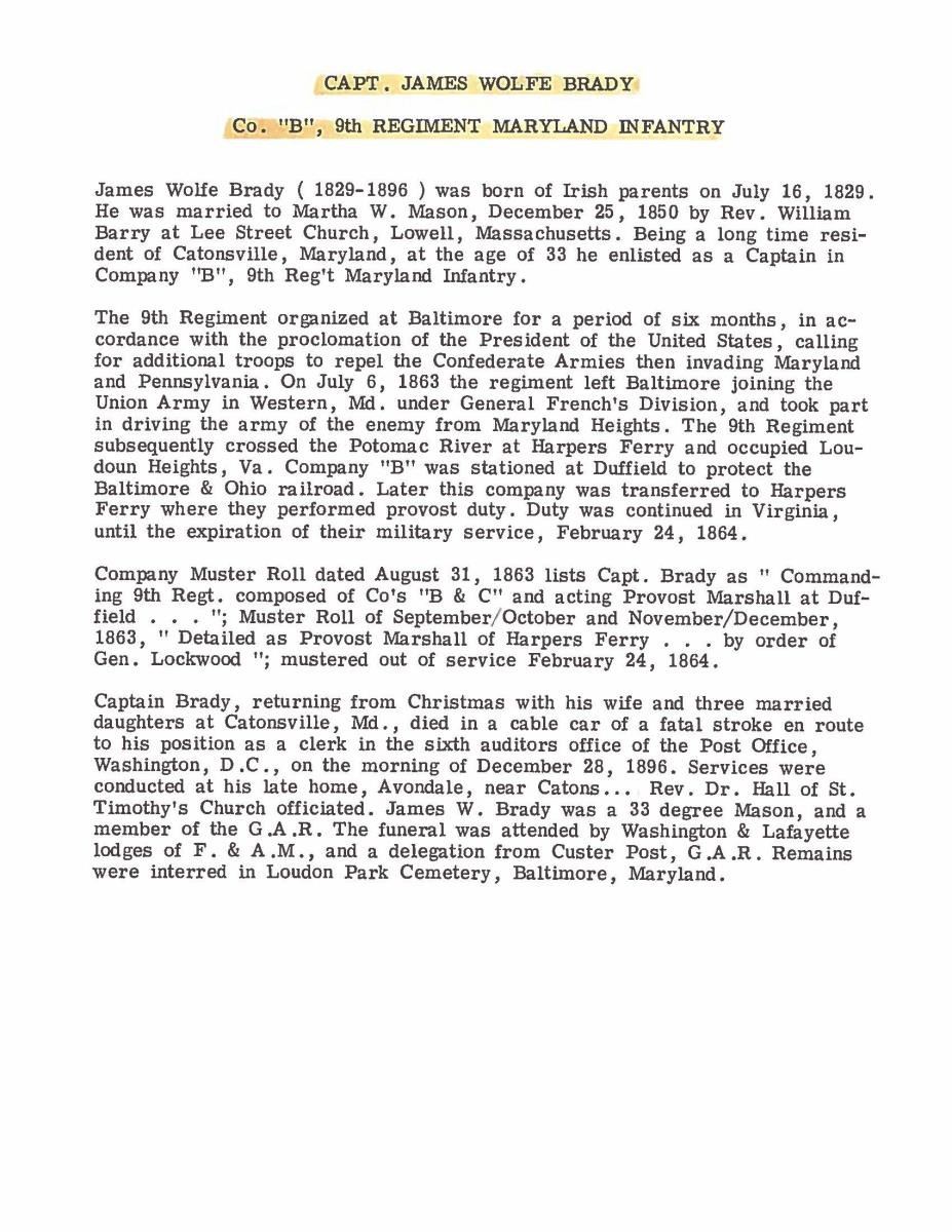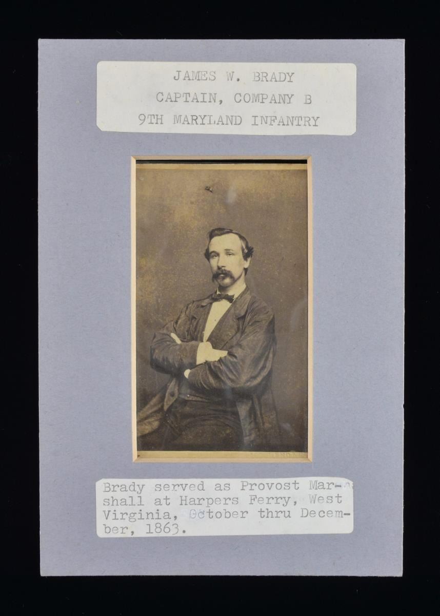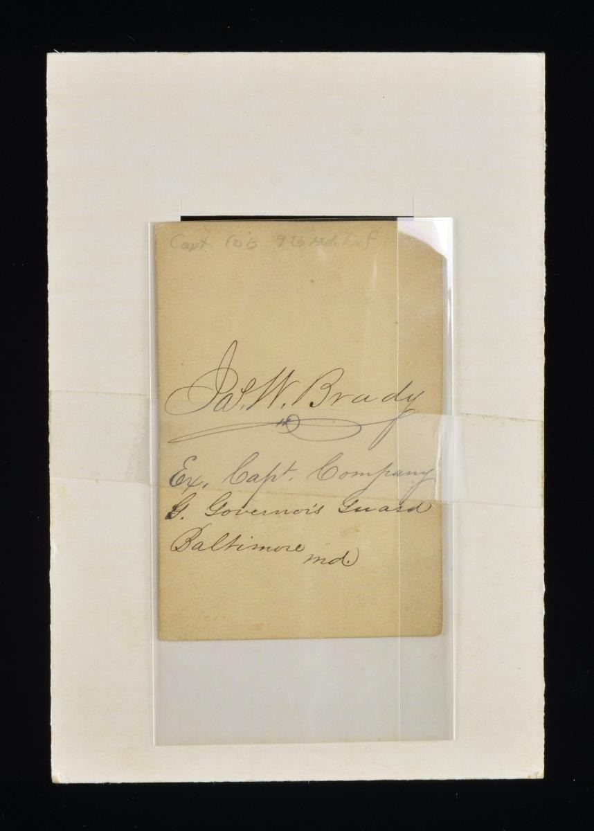 Rare red quatrefoiled Baltimore made cap is from direct descent of James Brady family with signed affidavit from great grandson. Other personal affects include 2 captain's Smith patent shoulder straps, hat cord (GAR), patent papers, and copies of family letters, newspaper obituary. There is also included a fine CDV of Brady with ink inscription. This grouping was part of the late Arthur “Gil” Barrett and he displayed this as part of his Maryland collection for many years.