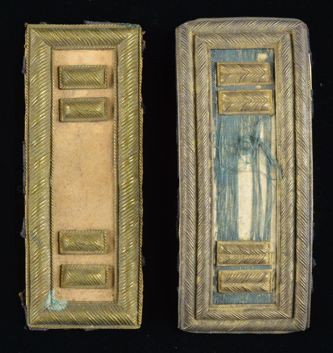 James W. Brady (1829-1896) entered service as captain June 17, 1863 and commanded 2 companies of 9th Maryland infantry in Dept. of W. Virginia. Brady was detached as Provost Marshall of Harper’s Ferry September 30, 1863 till mustering out February 23, 1864. The 9th MD lost 124 men in their short time in service, 2 killed at battle of Charleston and 122 died in camp from disease. UNATTACHED ACCESSORIES: file of research, family affidavit, 2 US patents, one for improved “Mason jar”. CONDITION: cap is good overall, some mothing, but good color and braid tightly attached, complete sweatband, black silk lining is shattered on sides, but padded crown is good with good gold impressed maker mark. Straps are poor missing backing fabric, hat cord is fair. (02-17011/JS). $5000-7000.