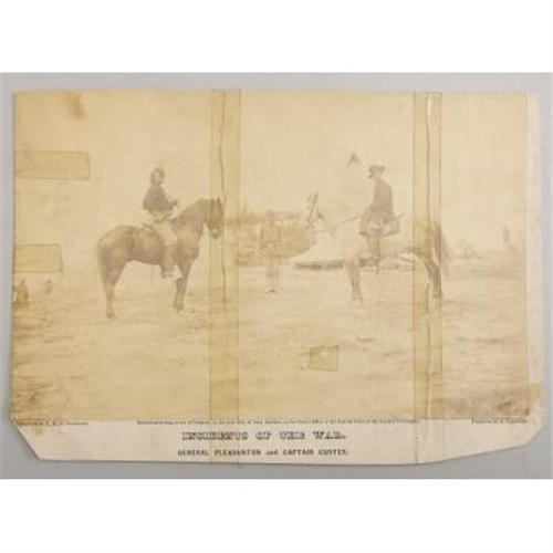 <B>CAPTAIN GEORGE A. CUSTER WITH MAJOR GENERAL ALFRED PLEASONTON 1863.</B></I> <B> </B></I>Captain George A. Custer and Major General Alfred Pleasonton, at pleasonton’s headquarters. (Brandy Station) Falmouth, Virginia, first week of June 1863. Gardner photograph, printed by Timothy H. O. Sullivan. Soon after this photograph was taken Capt. Custer was recommended by Pleasonton to be promoted to brigadier general. <I>Alfred Pleasonton</B></I> (July 7, 1824 - February 17, 1897) He commanded the Cavalry Corps of the Army of the Potomac during the Gettysburg Campaign, including the largest predominantly cavalry battle of the war, Brandy Station. In 1864 he was transferred to the Trans-Mississippi Theater, where he defeated Confederate General Sterling Price in two key battles, effectively ending the war in Missouri. Very rare image<I>.</B></I> This image has been broken in two places mounted on a copied re-production card, and taped profusely. <BR><BR><B>Condition:</B></I> Poor-good <BR><BR><b>Shipping:</b> Flat Material, Small (<a target="_blank" href="http://www.heritageauctions.com/common/shipping.php">view shipping information</a>)
