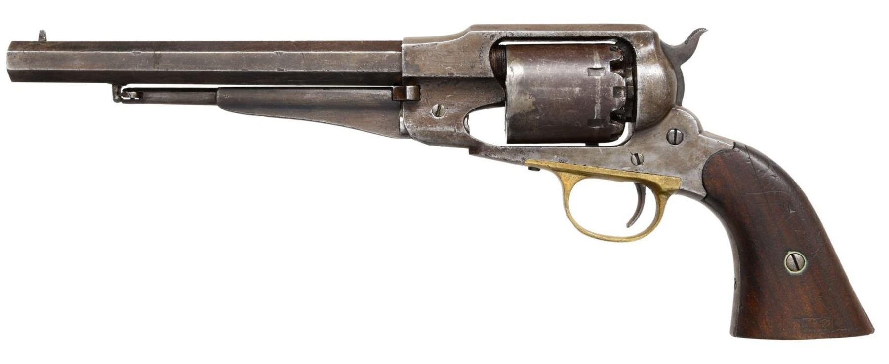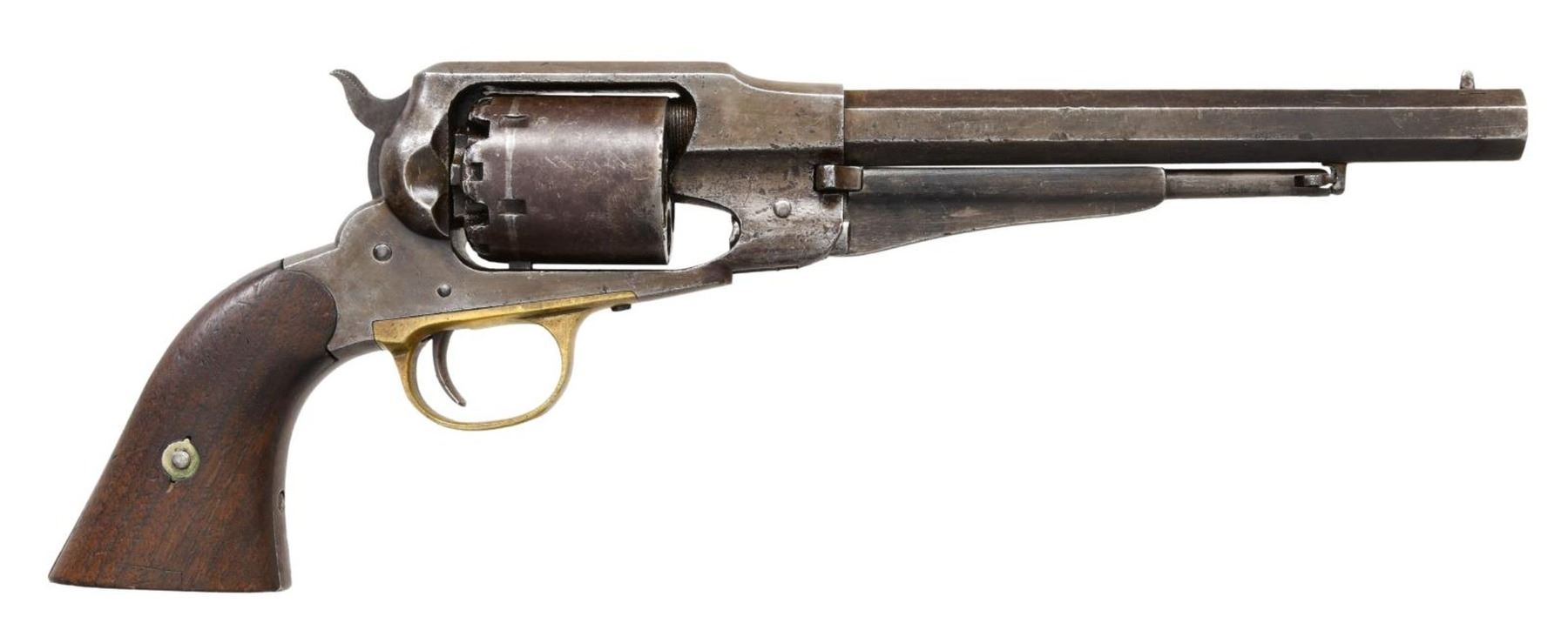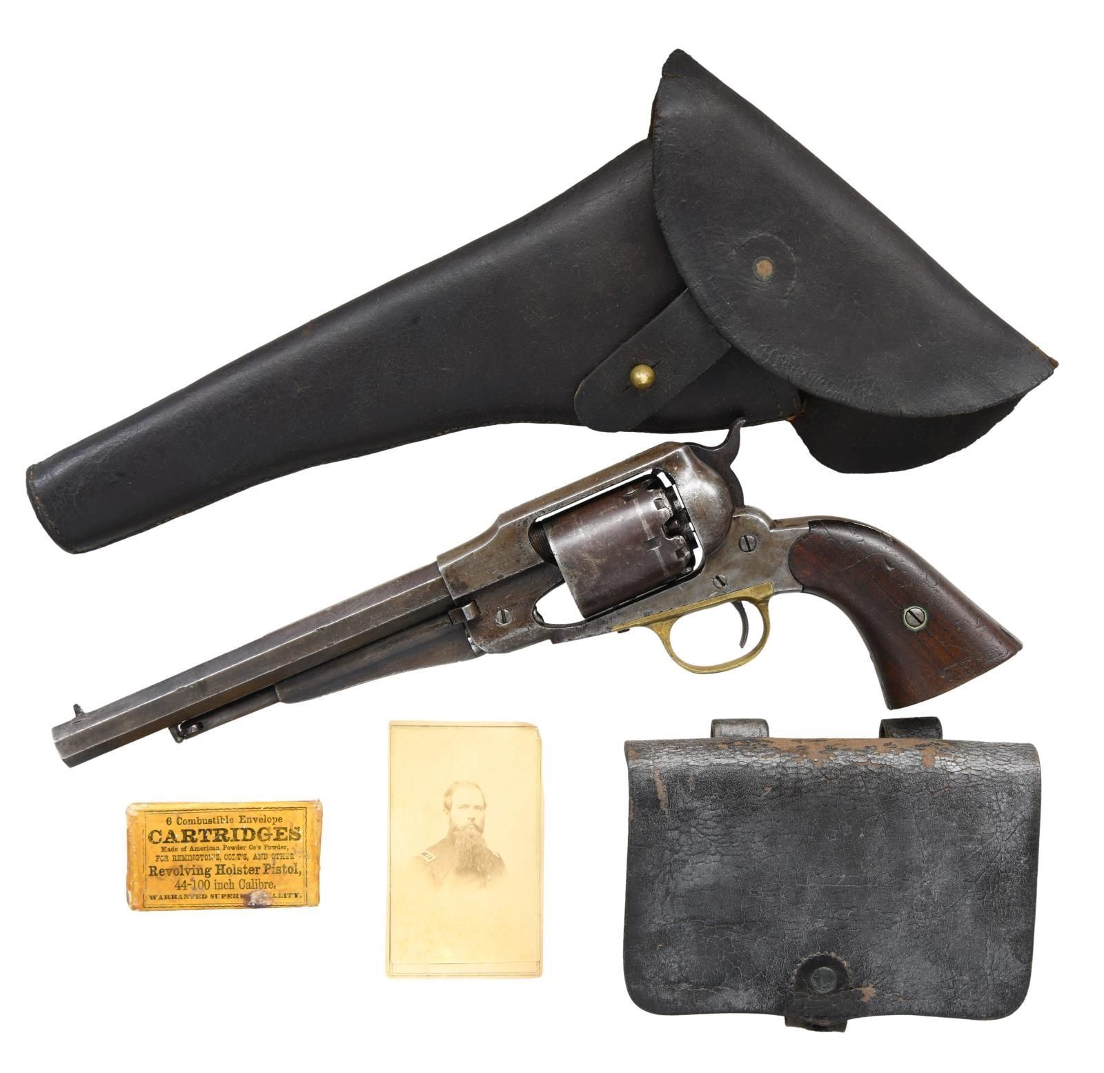 REMINGTON NEW MODEL ARMY REVOLVER, HOLSTER, CARTRIDGES, CDV & PISTOL CARTRIDGE BOX. Cal 44. S# 80665. This revolver consigned by local family with attribution of Capt. Lucius Morrill, New Bedford, Mass. Standard configuration with 8" octagonal barrel with 3-line barrel address. Most every part of this gun has a sub inspection and "GR" inspector cartouche on left grip. Lucius H. Morrill enlisted as 34 year old lieutenant November 21, 1861, 1st Mass cavalry, he rose through ranks and transferred to 4th Mass Cavalry in February 1864. CONDITION: good to very good overall. Revolver retains traces of its original blue finish. Matching S#s found on barrel, frame, and grips. Cylinder has "6613" on back from earlier gun. Strong action, good rifled bore. Holster is sound & complete, pistol cartridge box & sealed box of cartridges are very good. CDV is signed with rank on verso, slightly soiled and light faded. (01-23974/JS). ANTIQUE. $2,000-3,000.