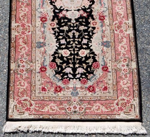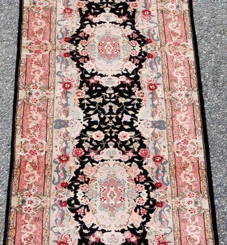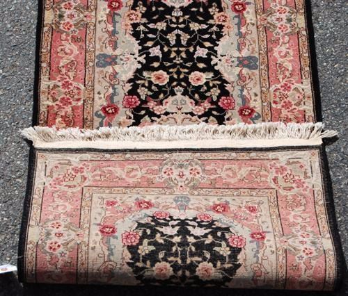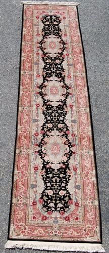 CAPTIVATING HAND WOVEN KASHAN DESIGN RUNNER W/SILK HIGHLIGHTS. MADE OF FINE QUALITY LAMB'S WOOL/PART PURE SILK PILE ON COTTON FOUNDATION, ALL NATURAL VEGETABLE DYE, THIS BEAUTIFUL RUG INCORPORATES A FREE FLOWING FLORAL PATTERN ON A BLACK BACKGROUND; WITH A CENTER ROW OF HIGHLY DETAILED MEDALLIONS AND IS FRAMED BEAUTIFULLY BY AN INTRICATELY DONE MULTI LAYERED FLORAL BORDER. PLEASE ALSO NOTICE THE RARE COLOR PALETTE IMPLEMENTED IN CREATING THIS RUG. THE SILK HIGHLIGHTS IN THIS RUG ALSO GIVE IT AN EXTRA LAYER OF BEAUTY AND AESTHETIC APPEAL.