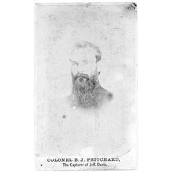 A rare war-date CDV of Lieut. Colonel Benjamin Pritchard of the 4th Michigan Cavalry who led the party that captured Jeff Davis and was promoted breveted brigadier general for that act. Back marked Glover, Philadelphia. A bit light with soiling, staining, and albumen loss at bottom of card, else good.