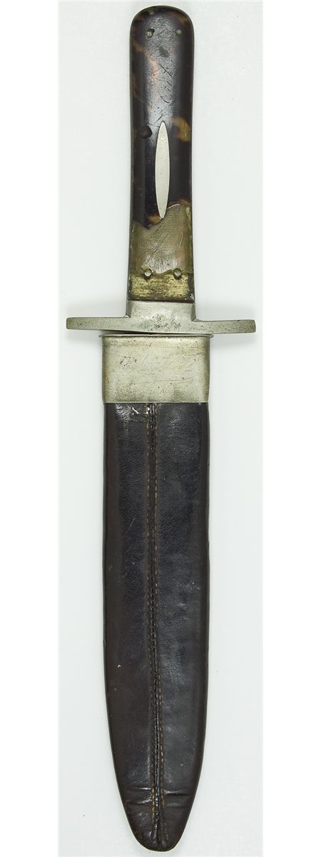 English import knife with tortoiseshell grip (chipped near handguard) which is inlaid with an oval metal tag, 10" long overall, the blade marked near the crossguard: "I X L", the other side marked: "WOLSTENHOLM & SON WASHINGTON WORKS". Scabbard also present, solid stitched leather with a tin throat, the belt loop partially cut and then crudely torn off, now gone. The scabbard bears a very light name cut into it with a sharp instrument: I ___ C ___ Hill". A ca. 1930 label, possibly from a museum, is mounted to a card present with the dagger. It notes: "...reportedly taken off the body of a dead Confederate by Geo. Haas somewhere in Mississippi...it may actually, have been 'ripped' right off the Reb's belt. On scabbard is scratched the dead Rebel's name...". One George Haas fought with the 131st NY at Port Hudson, and although not Mississippi, it may have been where he obtained this relic.