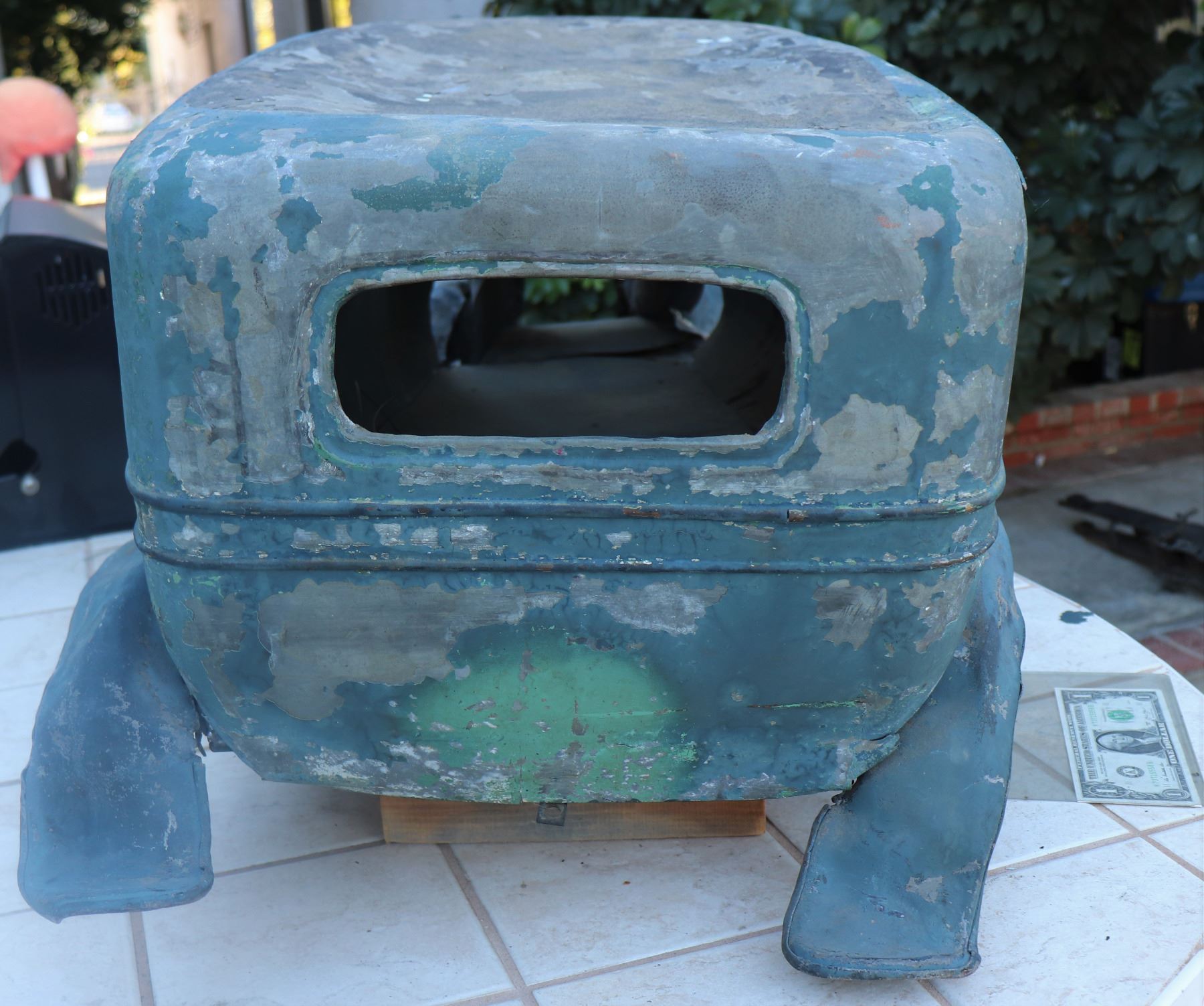 Large scale. constructed of sheet metal and lead to be dented or crushed on film. Even as a junk car, this makes an incredible display!