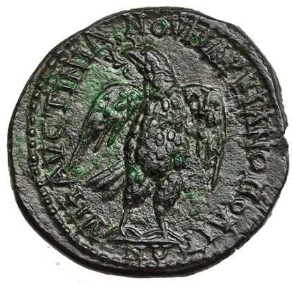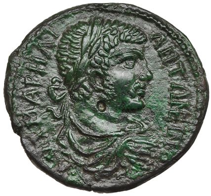 CARACALLA. AE-28. Marcianópolis. A/ Águila esplayada, mirando a izq.; VIFAUCTINIANOU MARKIANOPOLTWN. COP, BMC y SBI no citan. Pátina verde esmeralda. EBC-. Muy rara.