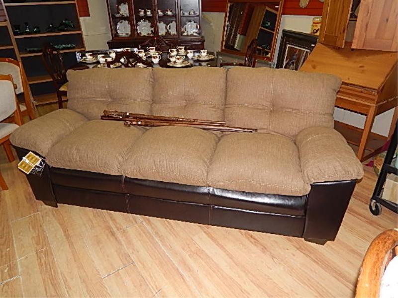 CARAMEL UPHOLSTERED SOFA WITH LEATHER ACCENTS - NEW