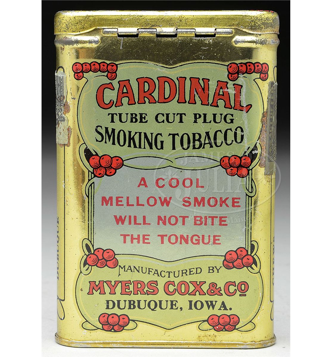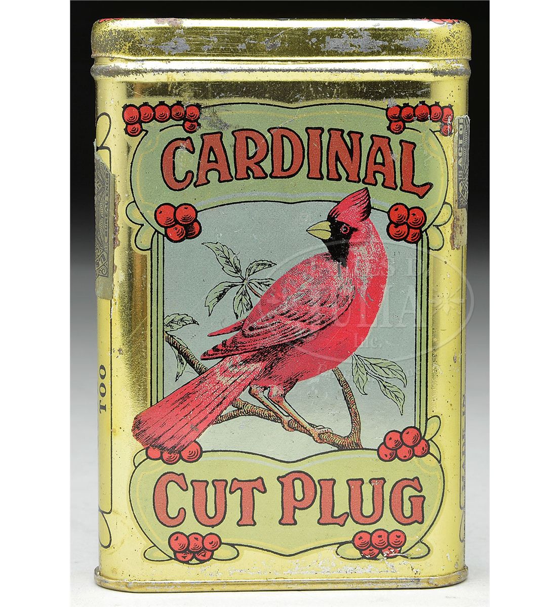 Colorful image of red Cardinal adorns the front of this extremely scarce tin. Manufactured by Myers Cox & Co, Dubuque, Iowa. SIZE: 4-1/2" t. CONDITION: Near excellent with just some light plating loss to the perimeter edge of top and embossed ridge. 1-13226-3