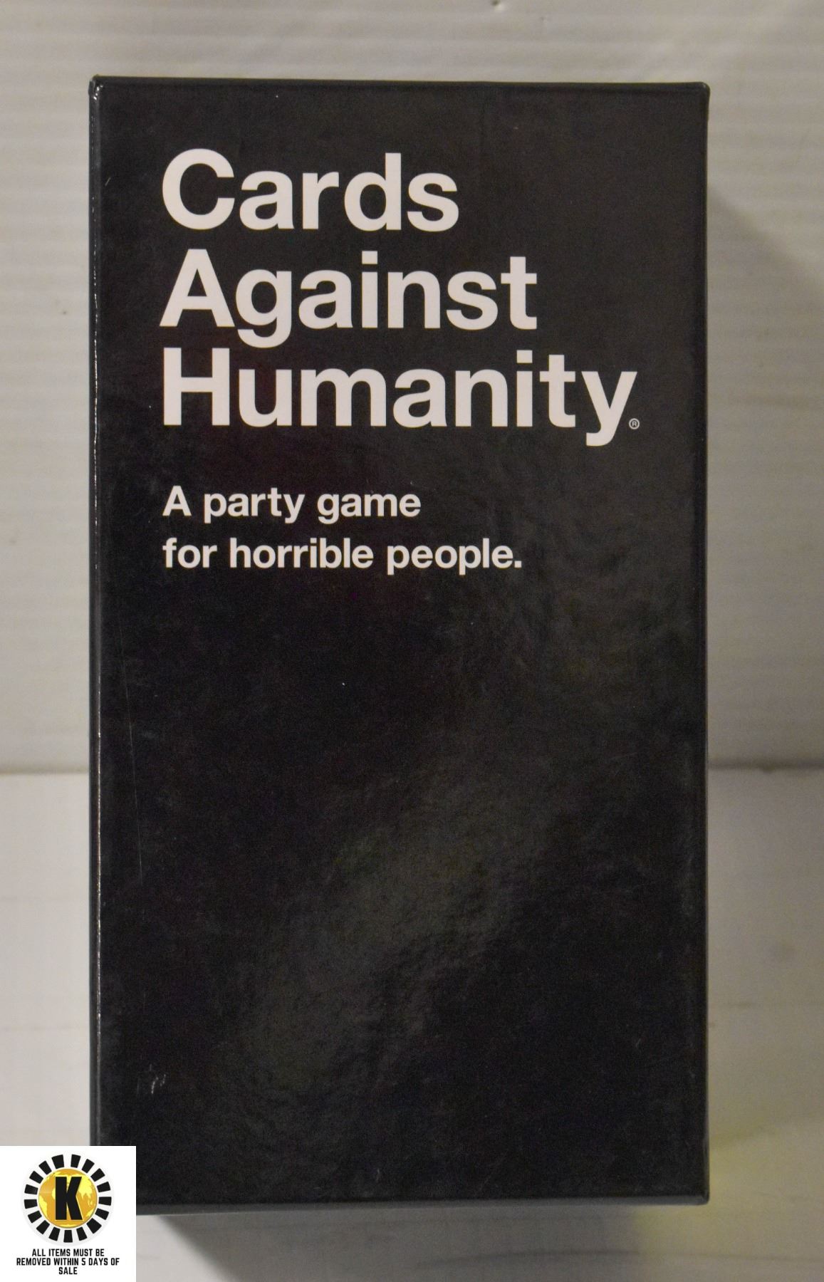 CARDS AGAINST HUMANITY IS A FILL-IN-THE-BLANK PARTY GAME THAT TURNS YOUR AWKWARD PERSONALITY AND LACKLUSTER SOCIAL SKILLS INTO HOURS - CARDS AGAINST HUMANITY IS AN ADULT PARTY GAME IN WHICH PLAYERS COMPLETE FILL-IN-THE-BLANKUSING WORDS OR PHRASES TYPICALLY DEEMED OFFENSIVE, RISQUÉ, OR POLITICALLY INCORRECT, PRINTED ON PLAYING CARDS. PLAYERS: 3 – 20+, AGE RANGE: 17+ STATEMENTS,