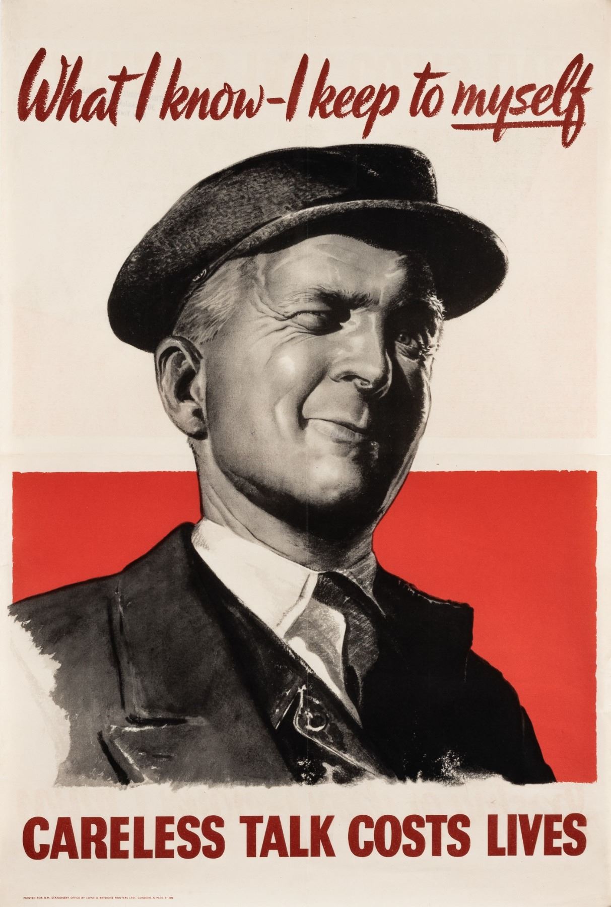 'What I Know - I Keep to Myself - Careless Talk Costs Lives', Printed for His Majesty's Stationary Office by Lowe & Brydone Printers, Ltd., 30 x 20 inches. Two 1-inch splits, minor splits, minor tears on edges, and creases.