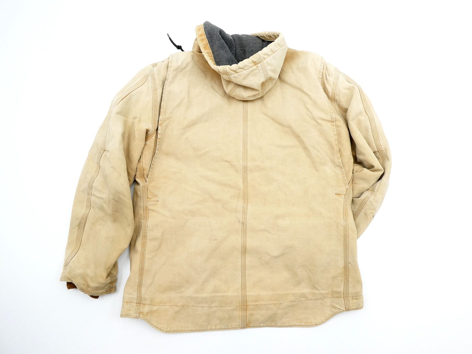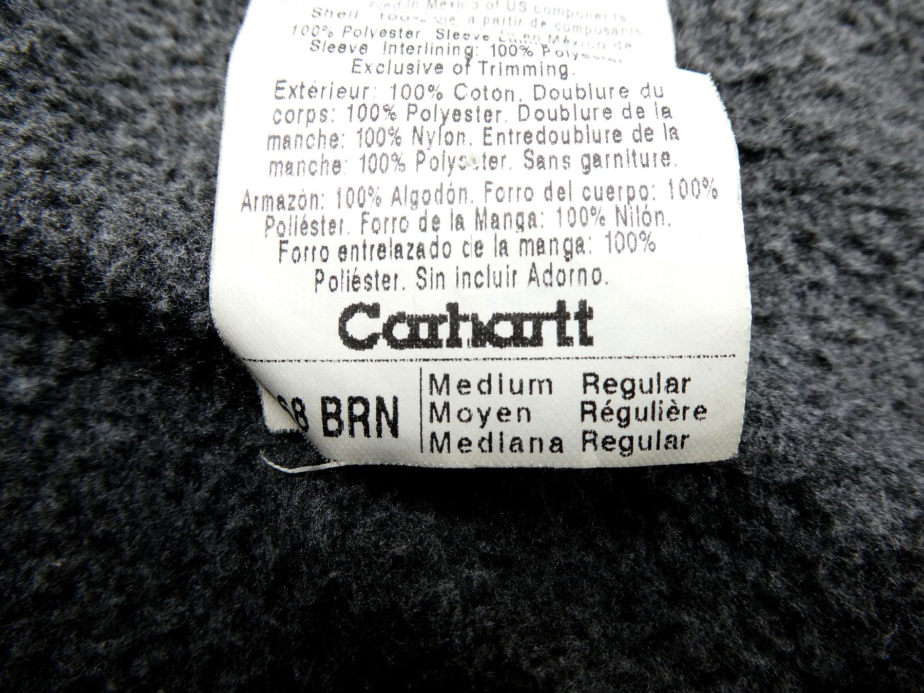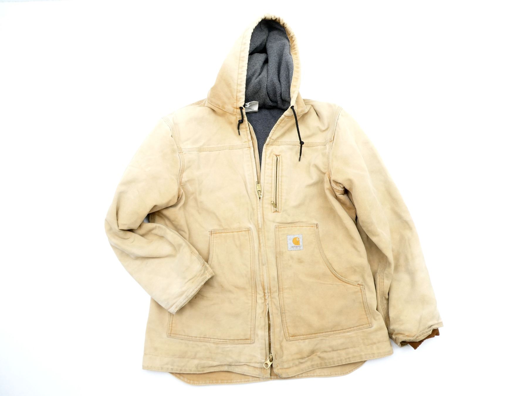 (1) LIGHT BROWN CANVAS JACKET WITH FLEECE LINING & HOOD, ZIPPERED FRONT (WORKS), MARKED: "CARHARTT", "C68 BRN, MEDIUM", ETC., SHOWS WEAR / TEAR. SEE PHOTOS.