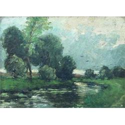 “Am Wiesenbach”. Oel auf Karton. - <U>Signiert</U> und ortsbezeichnet “Düsseldorf” sowie verso auf Klebeetikett von fremder Hand betitelt und bezeichnet. Größe: 18 x 23,5 cm. Schwach gegilbt. Gerahmt.
